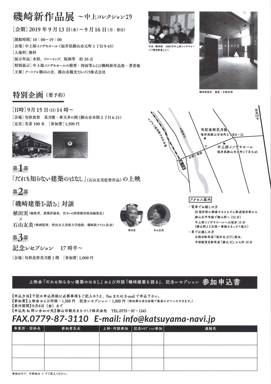 展覧会では故中上光雄・陽子夫妻が集められた作品を中心に水彩、ドローイング、版画を展示するとともに、磯崎建築紹介コーナーを設け、磯崎先生の作品集や著作を皆さんに見てもらう予定です。会場は磯崎先生の傑作建築の「中上邸イソザキホール」(元町1丁目)になります。また、特別企画としては「だれも知らない建築のはなし」(石山友美監督、第17回ヴェネチア・ビエンナーレ国際建築展 日本館正式出品作品)の上映と、「磯崎建築を語る」と題して植田実先生と石山友美監督(映画監督・秋田公立美術大学助教、磯崎新アトリエ出身)の対談を企画しました。