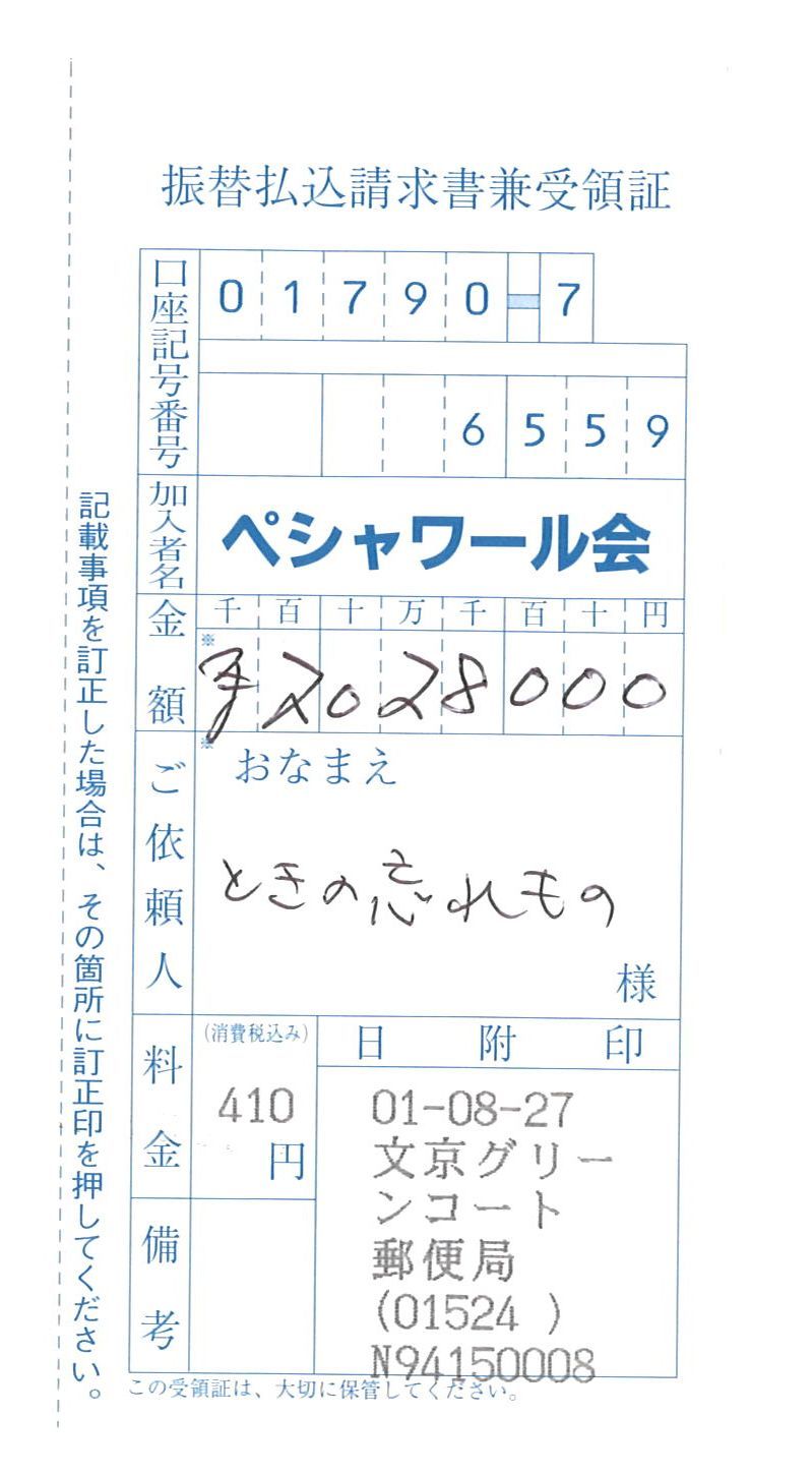 今回の頒布代金2,028,000円は全額をペシャワール会に送金いたしましたのでご報告します。