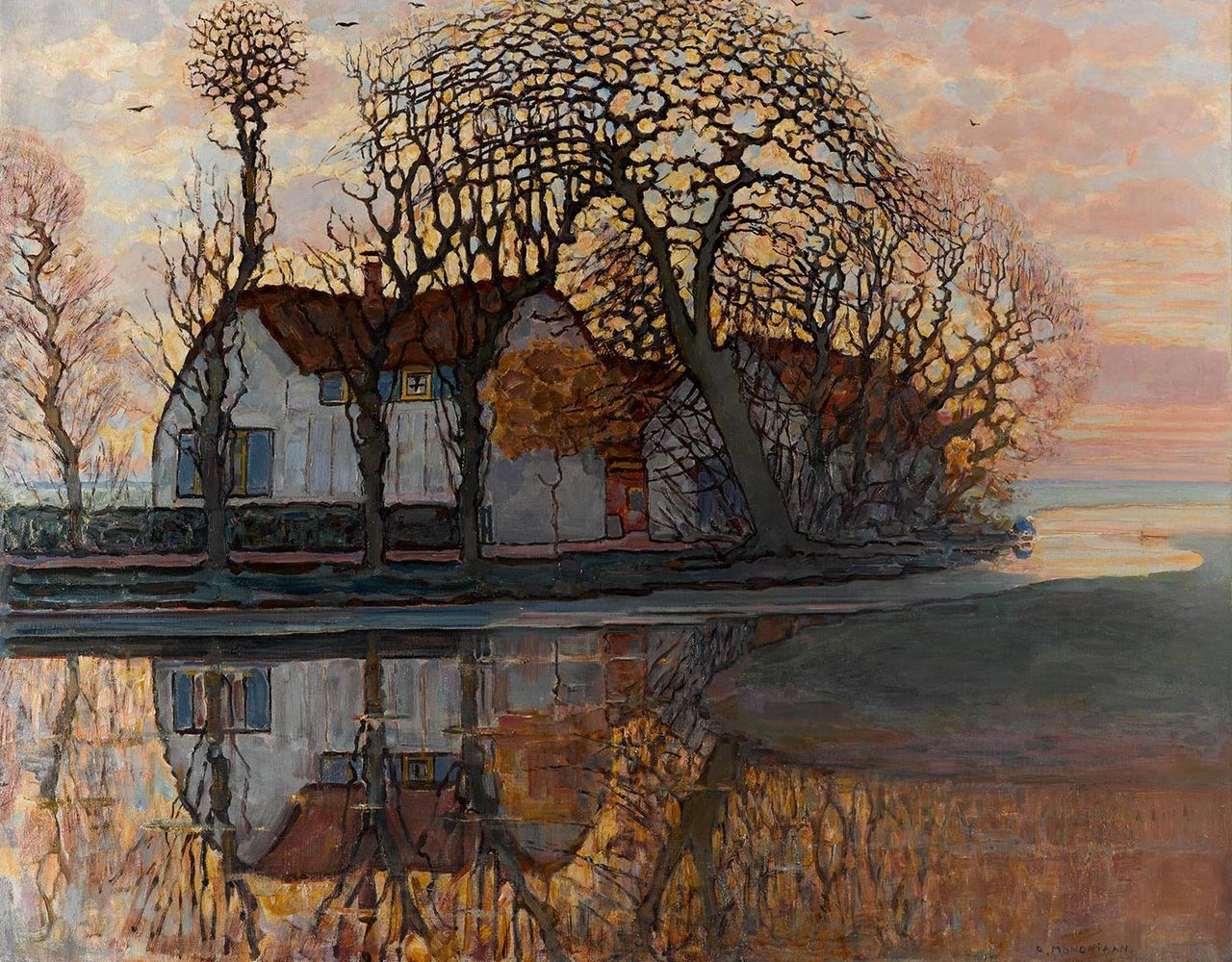 印象派の殿堂で抽象画の個展? と思われるかもしれませんが、特に世に知られた赤・青・黄の《コンポジション》シリーズ以外にもモンドリアンの作風は幅広く、この展覧会では名前の通りの人物画、風景画に静物画を主に展示しています。これらの作品は1920年頃に、モンドリアンの作品の一番のコレクターだったサロモン・B・シュライバーのために作家本人が選んだもので、その画風は印象派、ルミニズム、フォーヴィスム、シンボリズム、キュビスムに加えてモンドリアン自身が提唱したネオプラスティシズム(新造形主義)等多岐に渡ります。以下はその一部です: