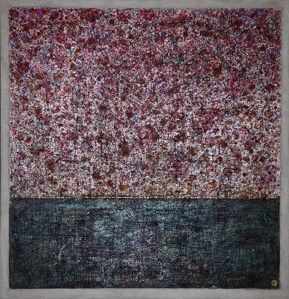 箔画(木パネル、漆、金・銀・プラチナ箔、石炭、樹脂、アクリル絵具)