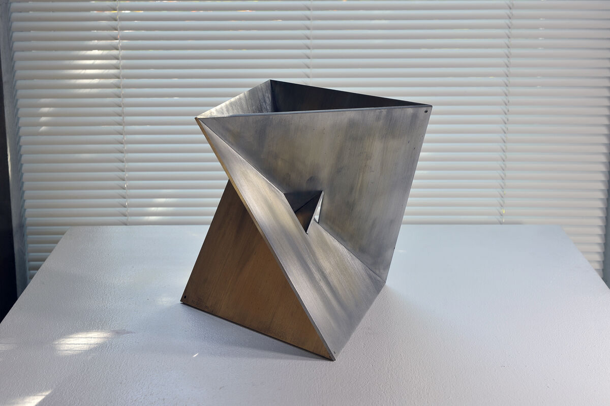 06堀内正和「四角い形の三角関係」1974年 真鍮クロームメッキ ヘヤ―ライン 22.0×22.0×21.6cm Ed.50 Signed 箱付き