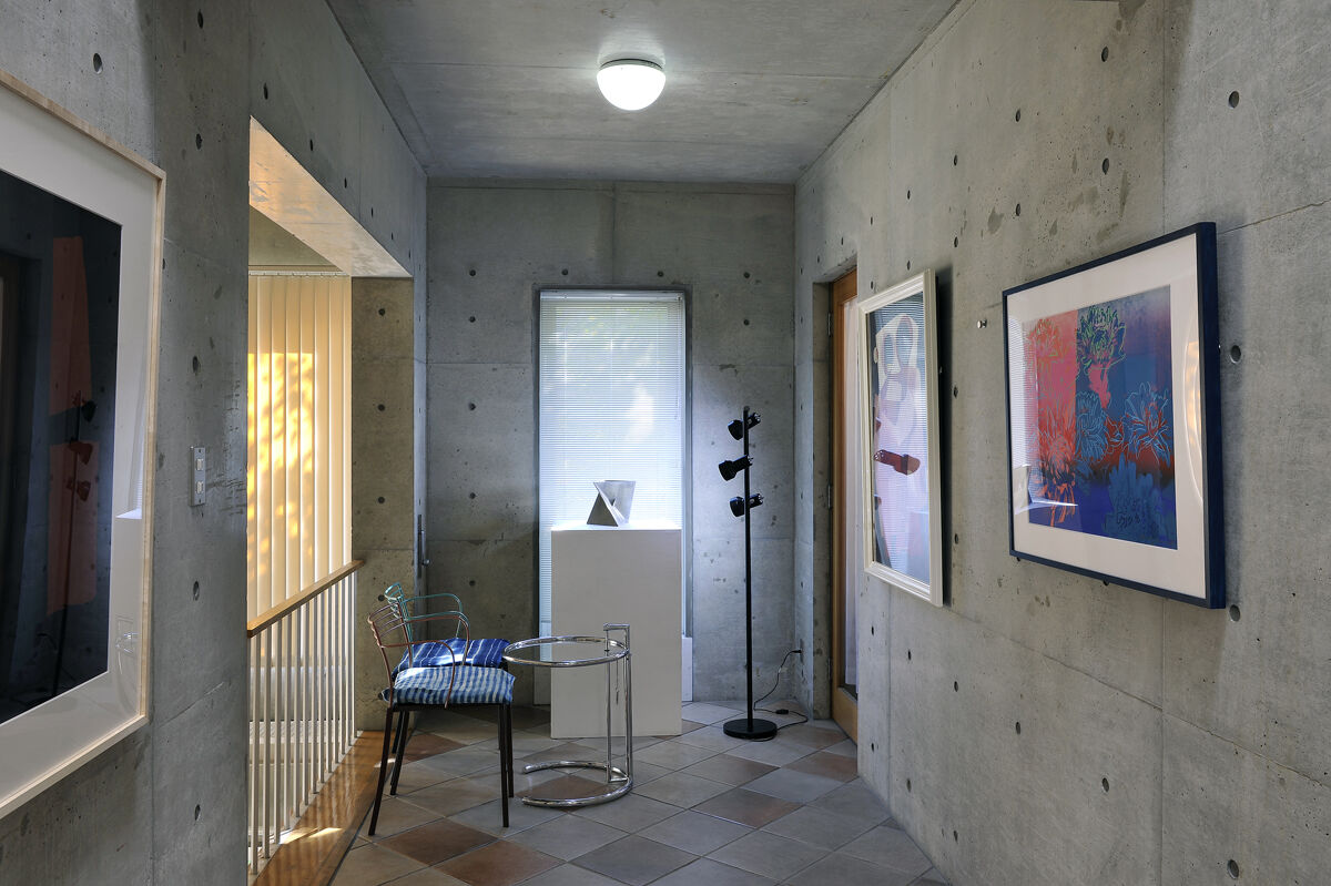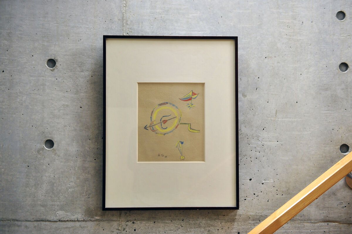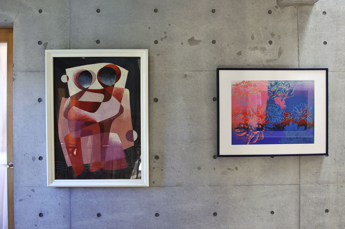 11左から、菅井汲「赤い太陽」、菅井汲「青い星」、リートフェルト「ジグザグ スツール」、関根美夫「そろばん」