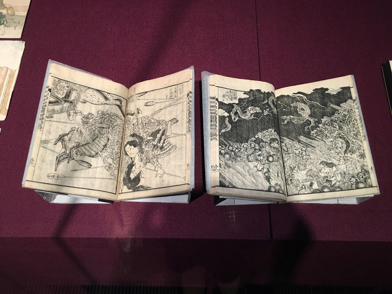 春章没後に勝川派を離れた北斎は「北斎宗理」「葛飾北斎」「北斎辰政」……と号を変え、世の狂歌ブームに乗って狂歌絵本や摺り物を次々と発表した。複数の絵師が美人画や風景画を担当する趣向で、なかには二大人気絵師・喜多川歌麿と北斎の合作も。読本では曲亭馬琴との名コンビで中国の奇書『水滸伝』を翻案した『新編水滸画伝』が、ページの枠の外まで使った臨場感ある挿画を収めている(のちに登場人物を集めた絵本『忠義水滸伝画本』を出したほどで当時のベストセラー)。東洋文庫が完全な形で所蔵する珍しい展示品には、風流な稽古事の発表会案内・演目リストや、版元の粋をみせる袋(ブックカバー)絵の一覧があった。