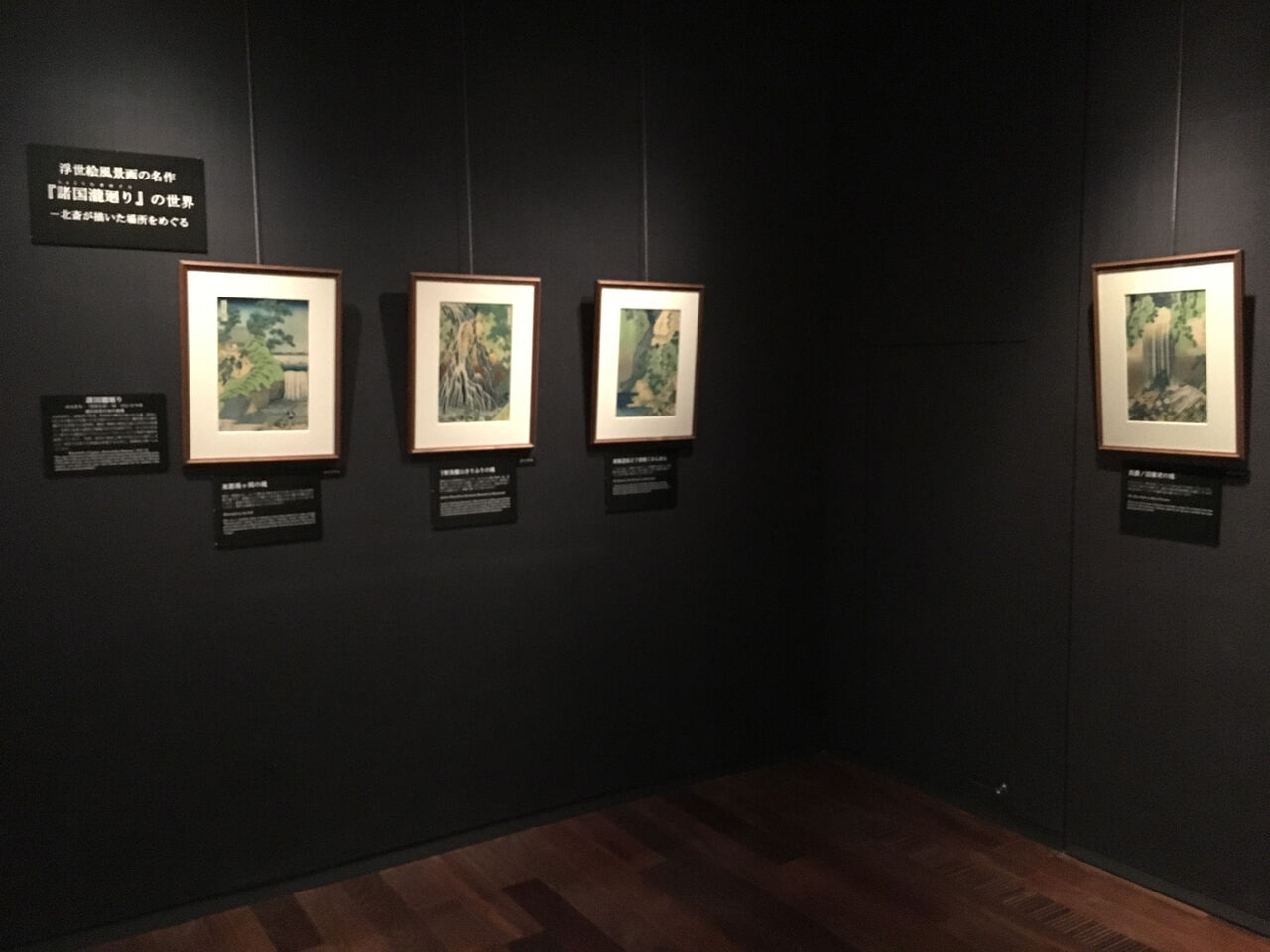 落ち着いた色調で統一された展示室。池山氏によると、今展のハイライトは大判錦絵「諸国瀧廻り」オリジナル全8点(11月末をめどに4点ずつの入替)で、青のグラデーションに注目くださいとのこと。いずれも初摺と聞く。展覧会のキャッチコピー「あの絵はないけど、これがある!!」の「これ」が、同作全点とは嬉しい驚きである。