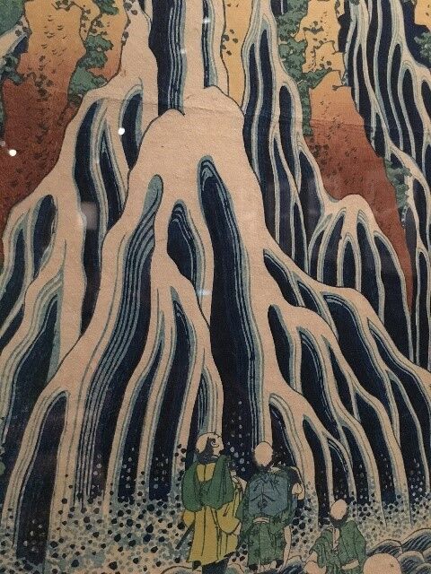 版元は北斎の代表的な錦絵「富嶽三十六景」でベロ藍と藍摺(藍を主色に、主版も墨でなく藍で刷ること。版木が消耗するとしてほどなく中止)をおおいに宣伝したといわれる永寿堂西村屋与八で、「諸国瀧廻り」もこの延長にある。浮世絵版画(錦絵)の冴えた藍(青)色を出すのに、一時期、西洋や中国からもたらされた西洋の合成顔料プルシャンブルー(ベルリンブルー、通称ベロ藍)が流行した。従来の露草や藍の植物から抽出する顔料より発色がよく、退色しにくかったからである。北斎はぼかしによる濃淡で空や水面の遠近を、線や点の明暗で水流や水しぶきの勢いを演出した。特殊なレンズで捉えたかのような大胆な造形。一瞬の表現への探求がみてとれる。そして人物の仕草の細やかさ。旅支度や着物の紋には時代の文化風俗や出版元を示す、ときに茶目っ気のある情報が盛りこまれていると池山氏にうかがいながら観た。この日は「下野黒髪山きりふりの滝」を含む4点がオリジナル。2017年にロンドンの大英博物館で開催され、話題となった葛飾北斎展「Hokusai: beyond the Great Wave」には同点と「木曽路ノ奥阿弥陀ヶ瀧」が貸し出されたそうだ。展示替後は躍動感のある「和州吉野義経馬洗滝」などが観られる。