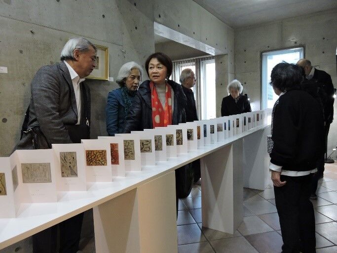 武男氏によれば、龍起は結婚や新築祝いに、あるときは花や少女のイメージが画面に浮かんでいるから娘へと作品を譲ってくれたが、夫人の懐妊の時だけは「僕の絵は胎教には良くない。僕の絵よりルノワールの方がいいんじゃないか」と言ったそうである。自身の強い内的世界をそのように考えていたのが興味深い。実はまだ飾って楽しめるだけの小作品を所有していると語る武男氏や、義父の絵が大好きでしたという夫人の言葉からも、作品が家庭をやわらかく包みこむ存在であったように思われるからだ。長年、家族とともにあった今回の小品には観るべきものが多いだろう。デビュー前後から亡くなる前年までの変遷をたどることができ、技法・モチーフ・色調も多様で、具象、抽象、油彩、水彩、コラージュ、ドローイング、エナメル、リトグラフのほか、ハンドバッグや羽織まである。多くが包まれていたということだから、他者には新しい「作品史」であり「画家の家族史」である。