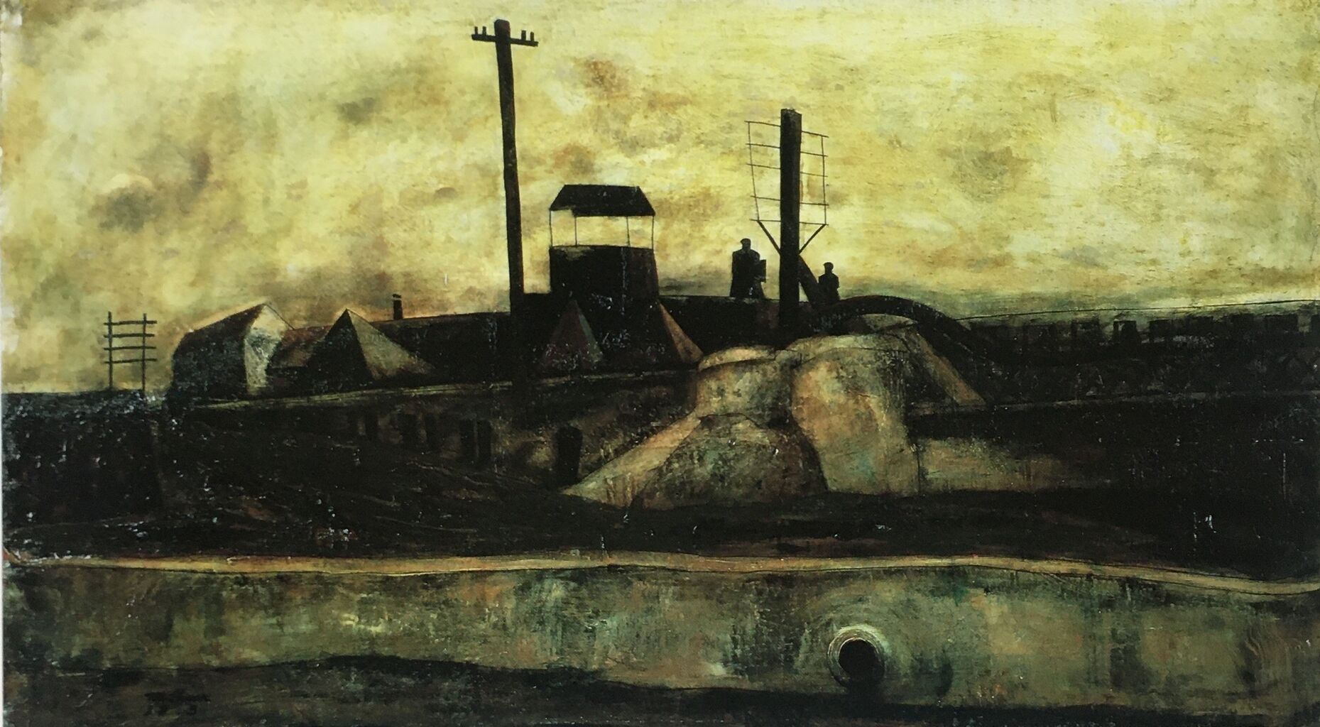 時折、松本竣介の建物を描いた風景の中には何だかよくわからないものが描かれていて気になることがある。有名なのは『鉄橋付近』という作品の中央にある人のシルエットのように見える二つの黒い影だ。人の影と言われてしまうとそうとしか見えなくなるが、元になった素描を見ると実際は建物に付属する建築物の一部のようだ。(同カタログ118頁から119頁 図3)