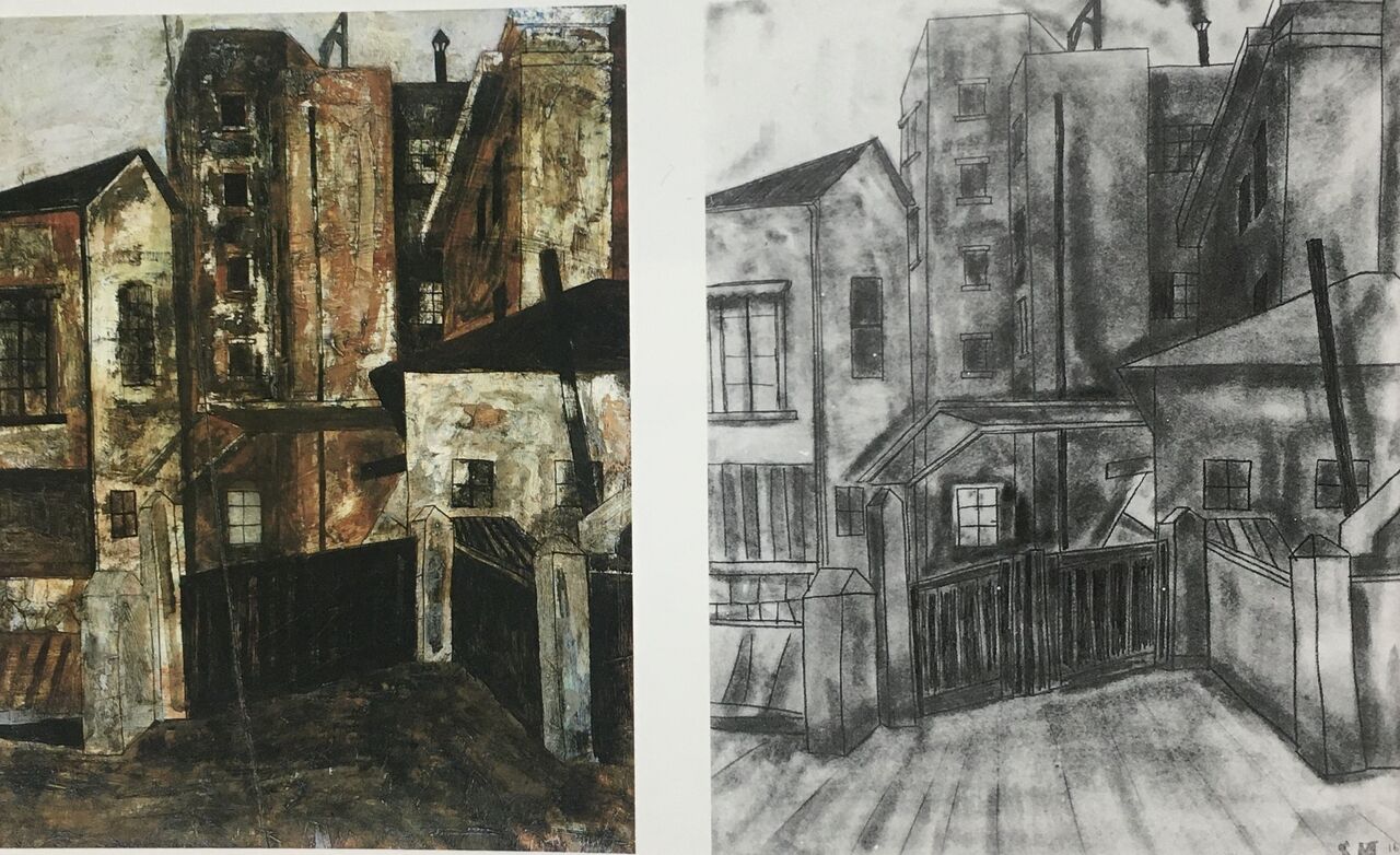 どうしてこのようなことが起こるのか、といえば、これは松本竣介の作画過程に原因がある。基本的には実際の建物などのスケッチが油彩の制作には使われるのだが、それらのほとんどはそのままではなく、自在にデフォルメされたり、他の場所の別のモチーフと組み合わされたりして、実際のその場所やその物がそのまま描写される訳ではないので、こういうことが起こる。つまりは物の形が造形的に綜合されて、そこに表現されるからなのだろう。線や幾何的な形態が絵画の要素として重要視されているのだ。しかしだからと言って、雰囲気、あるいは情緒や精神性がないがしろにされる訳ではない。色彩や筆致、マチエールが表出するメランコリーやリリカルさは松本竣介の絵画の持ち味であり特徴であることは言うまでもない。