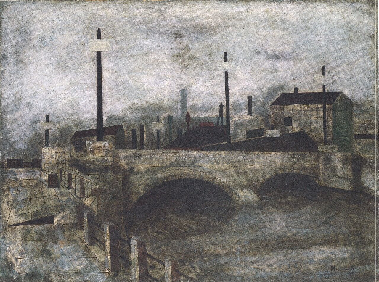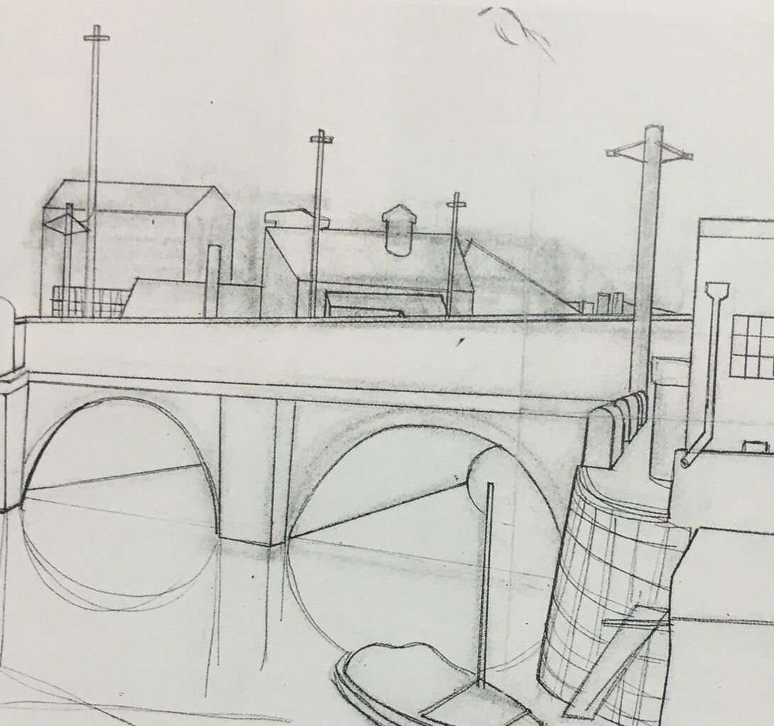 あるいは『運河風景』(図4)の中央やや右寄りの太い柱状の上部の二つのV字を横にしたような飾り?も不思議なものだ。素描を見てもはっきりしない。『運河(b)』(図5)というタイトルのついた素描では橋の奥にも同じ形の飾りがついた柱が描かれている。橋のたもとにあった照明かも知れないし、あるいは電柱の碍子のついた支柱かも知れないが、よくわからない。