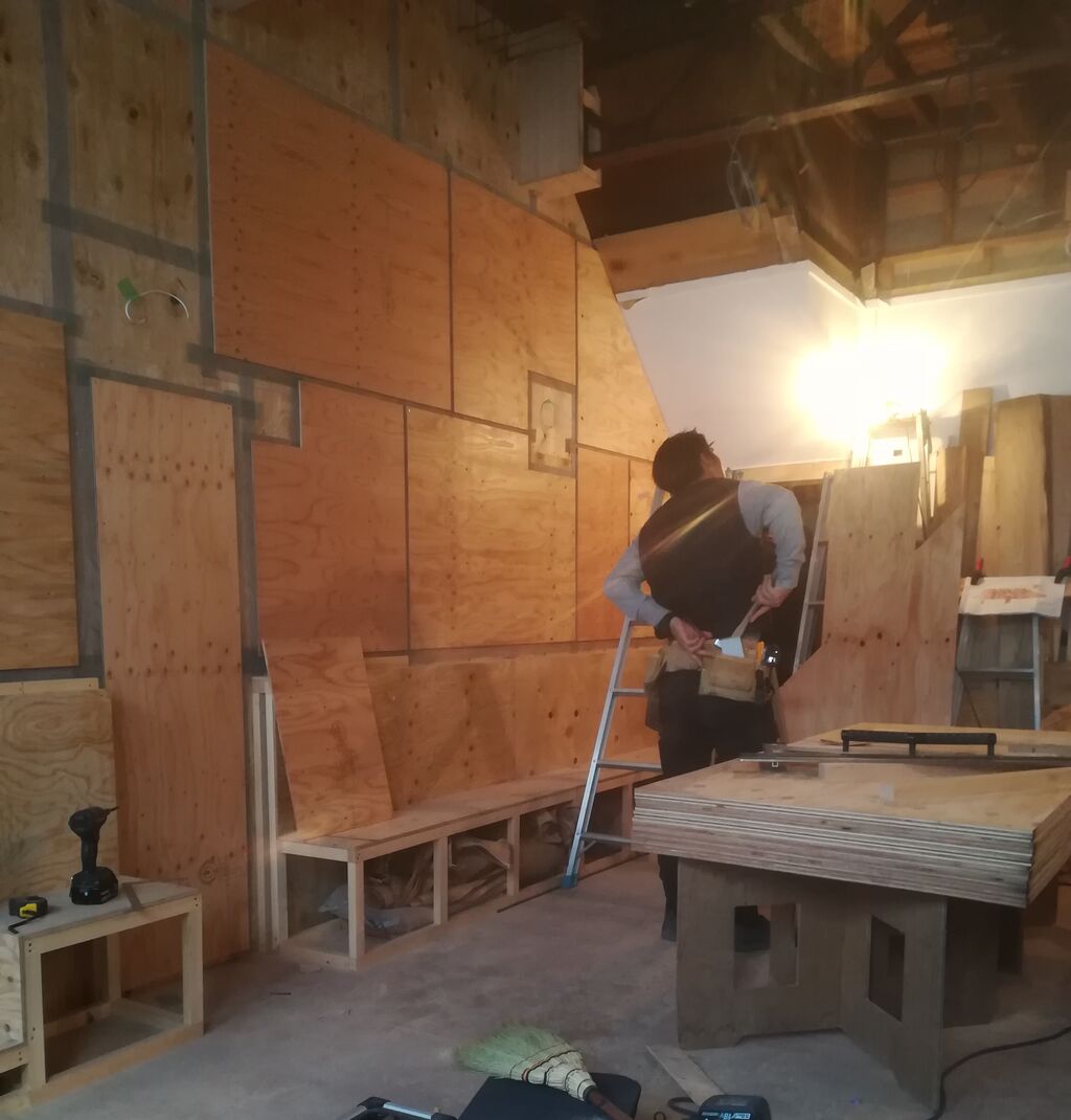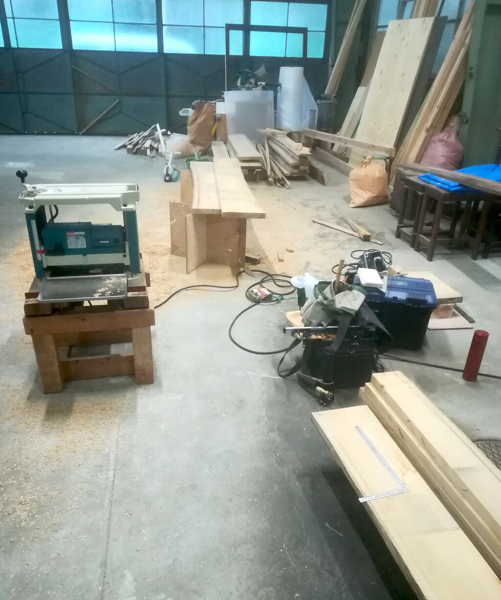 左官工事がひと段落した後、この原稿を書いている今現在は、造作家具の制作である。現場に入ってもらっている地元の大工さんの作業場を少しお借りし、カンナがけでの材料取りから進めている。