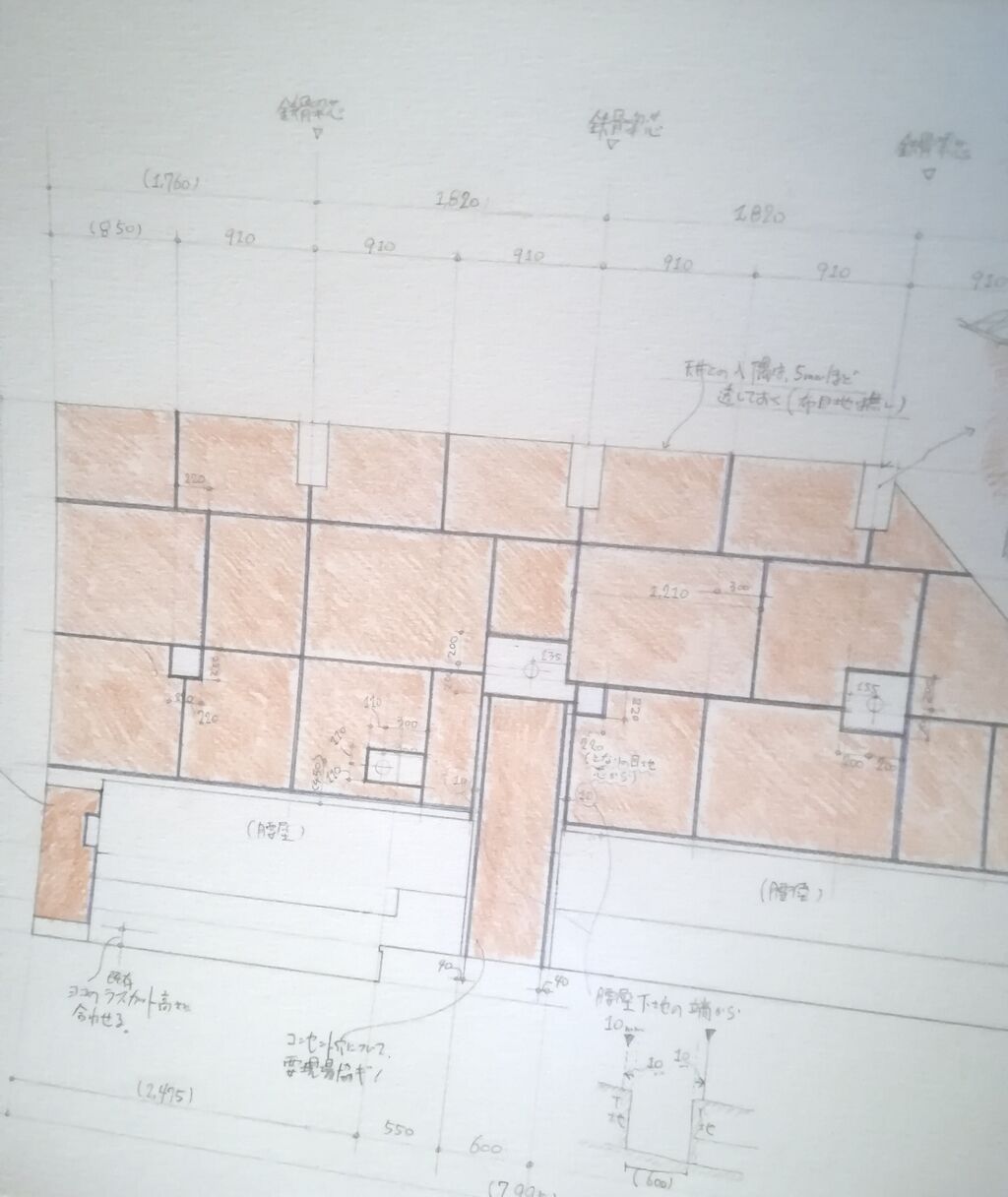 割付け図はあらかじめ作成し、一部は既存との取り合いなどで現場にて修正を加えた。作図の作業では、現場での墨出し方法と作業手順を想定しながらおこなうので、それに応じてデザイン自体も無駄が削ぎ落とされていく。