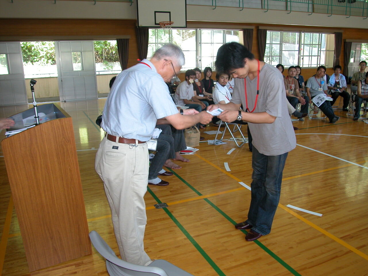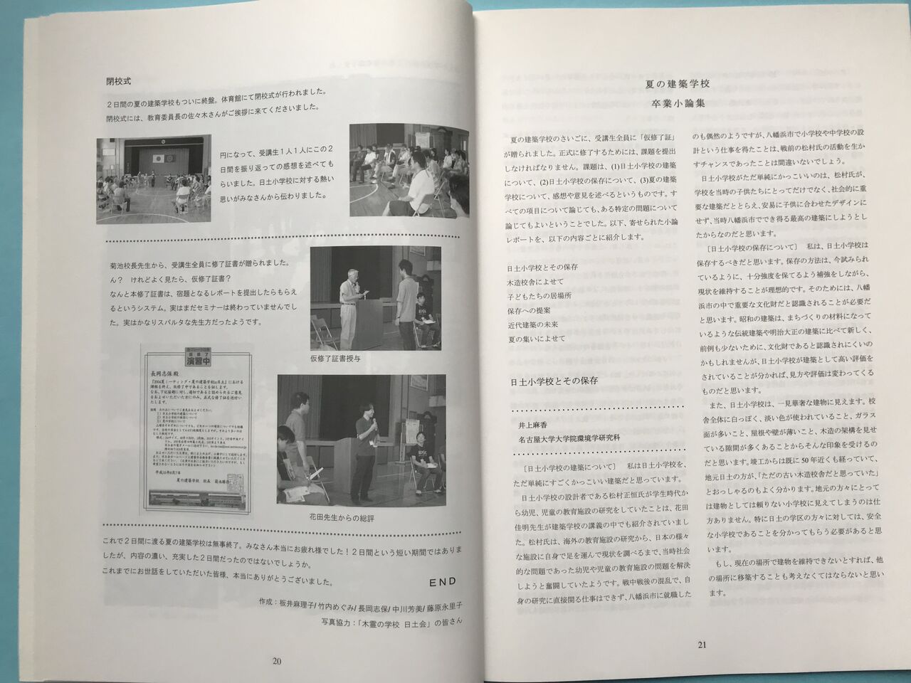そして菊池「校長」から全員に修了証書の授与が行われたが、よく見ると「仮修了中であることを証します」と書いてある。同時に宿題が出され、その提出をもって「本修了」とするという仕掛けだった。宿題は、「(1)日土小学校の建築について、(2)日土小学校の保存について、(3)夏の建築学校について」感想や意見を述べよというもので、提出されたレポートは、後述する冊子に掲載された。