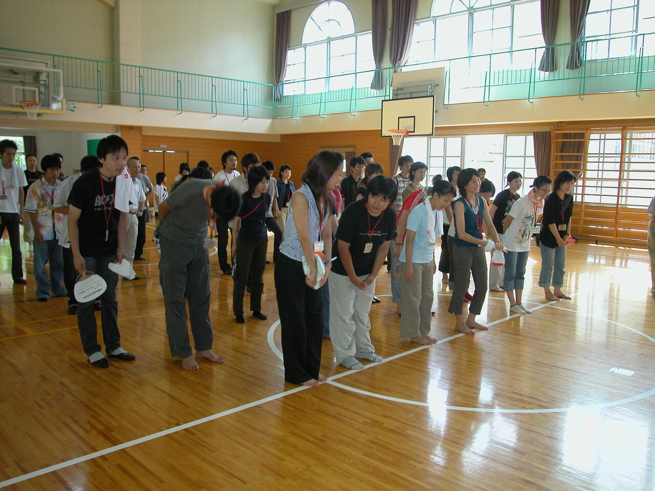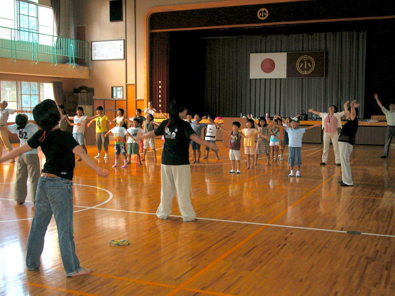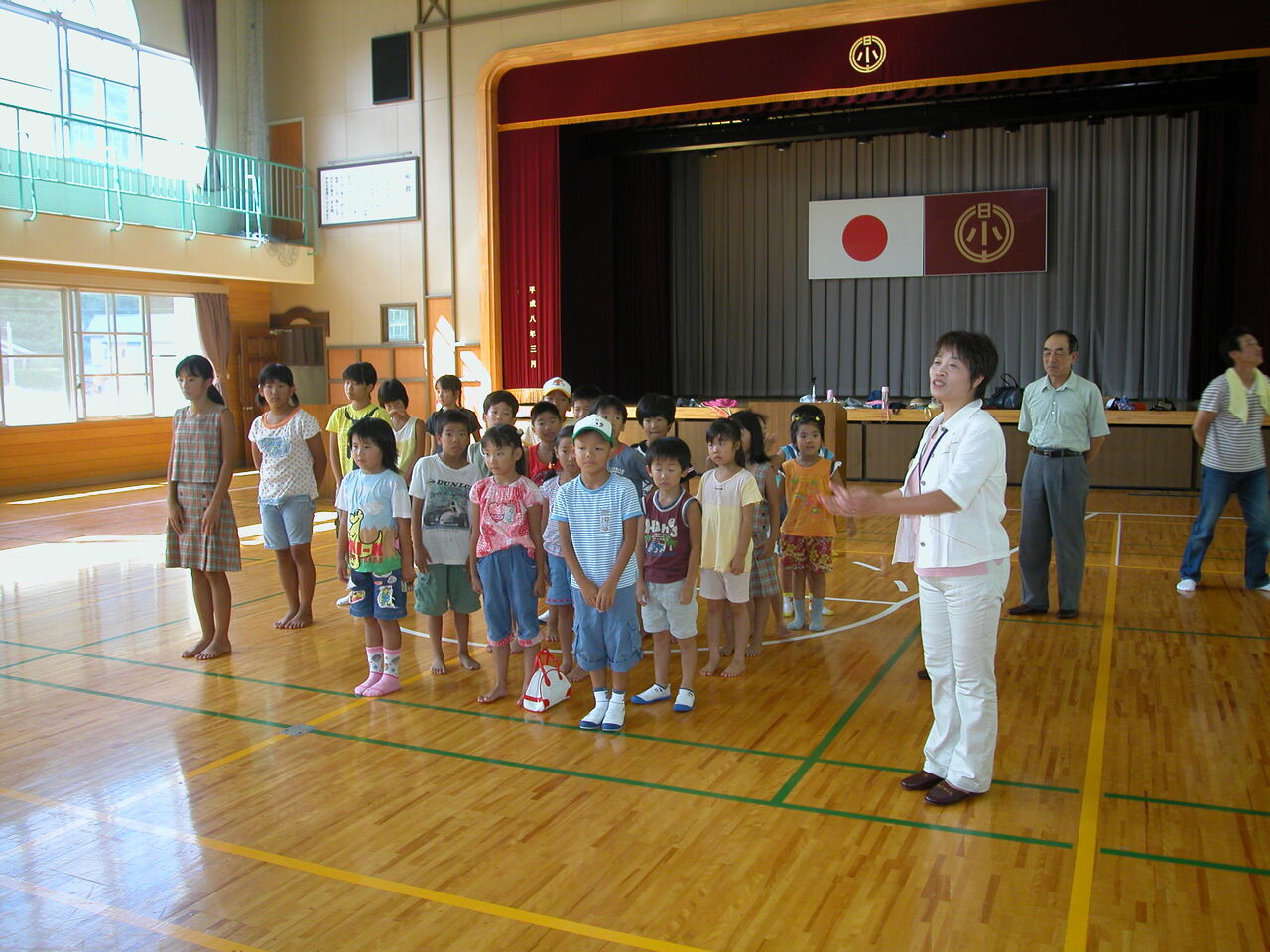 翌8月7日(土)は日土公民館で朝食をいただいた後、日土小学校の体育館へ移動。そこには日土小学校の子供たちが来てくれていて、対面式とラジオ体操をした。