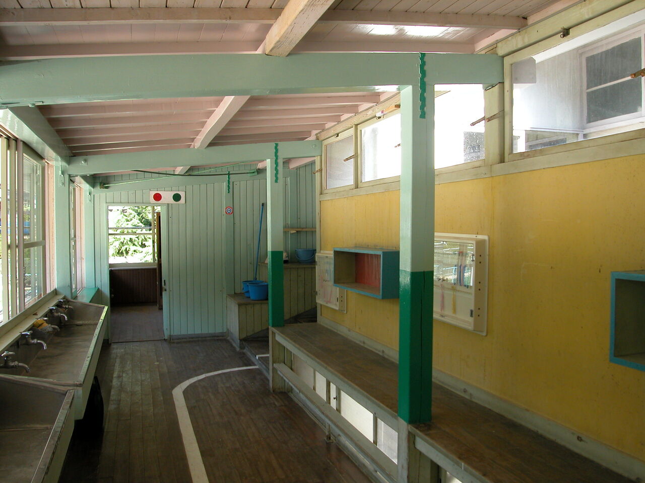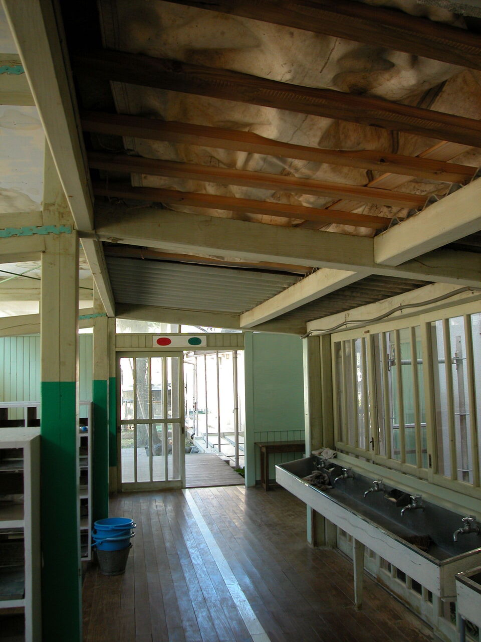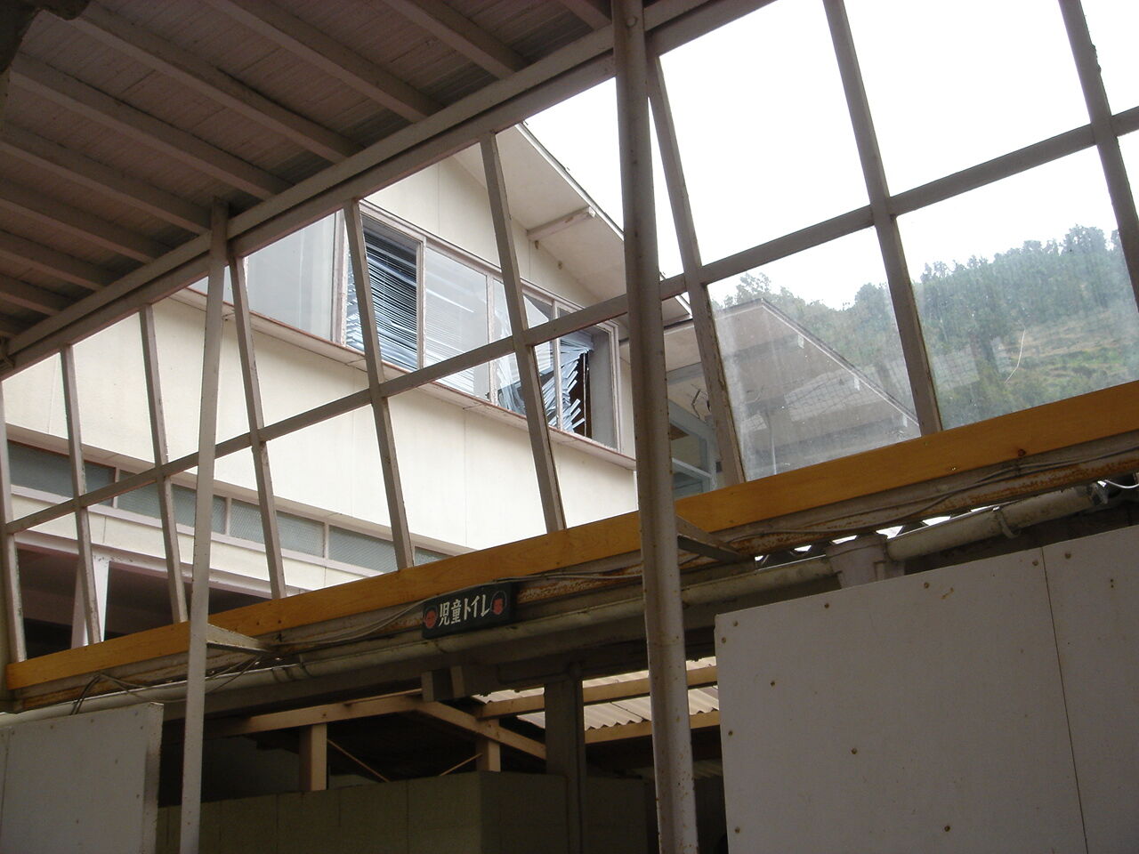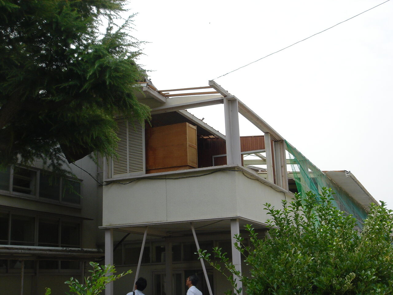 西日本各地に大きな被害をもたらした台風18号の強風が、9月7日、日土小学校東校舎の北東部分(廊下端部)の鉄板屋根を、野地板と垂木直張りの天井板ともども吹き飛ばしてしまったのだ。図書室や渡り廊下などのガラスも割れた。