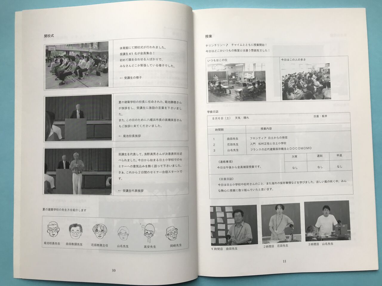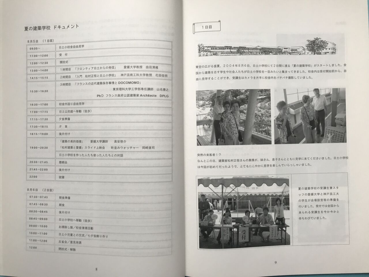 巻頭は曲田先生の「はじめに」。夏の建築学校の総括から台風被害、そして保存運動の展望までが簡潔に書かれている。その後には、山名先生によるドコモモの活動を紹介する「国際的な拡がりをもつドコモモの活動について」、高安先生の「地域におけるモダンデザイン」、参加した愛媛大学の学生さんが写真やイラスト入りで2日間をまとめた「夏の建築学校 ドキュメント」、修了条件として提出されたレポートを並べた「夏の建築学校 卒業小論集」、私の「真の学校としての日土小学校—夏の建築学校を振り返って—」、七夕飾りを作っているときに参加者へ行ったアンケートを曲田先生と愛媛大学の学生・板井麻理子さんが集計・分析した「受講生が結びしもの—アンケート結果について—」、「校長」であった菊池さんの「夏の建築学校 受講生の皆さんへ」、岡崎さんの「日土小学校とまちづくり」、木霊の学校日土会の菊池彰さんによる「日土を襲った台風18号」、そして前述の杉山さんによる「台風被害と修復状況」である。