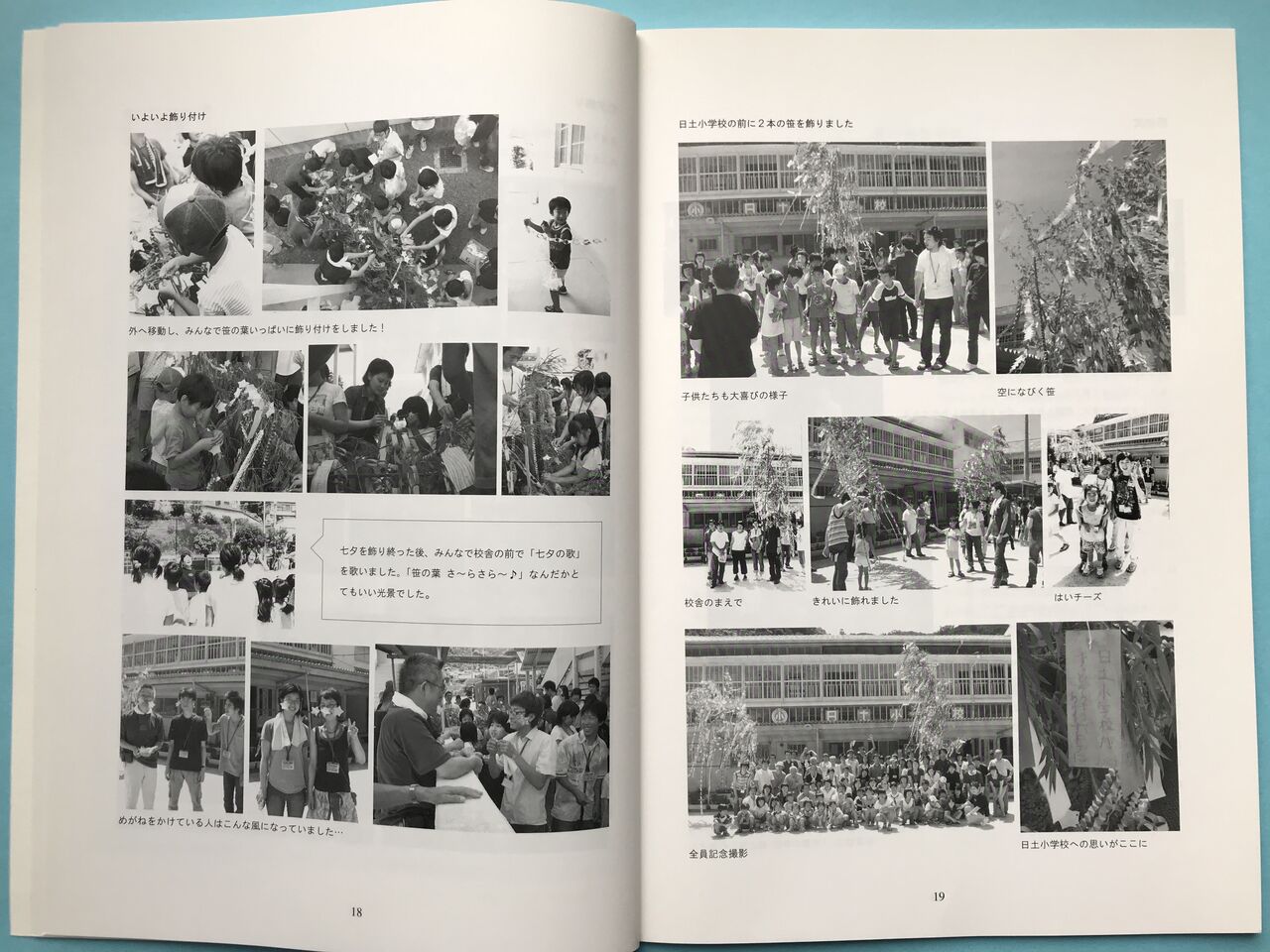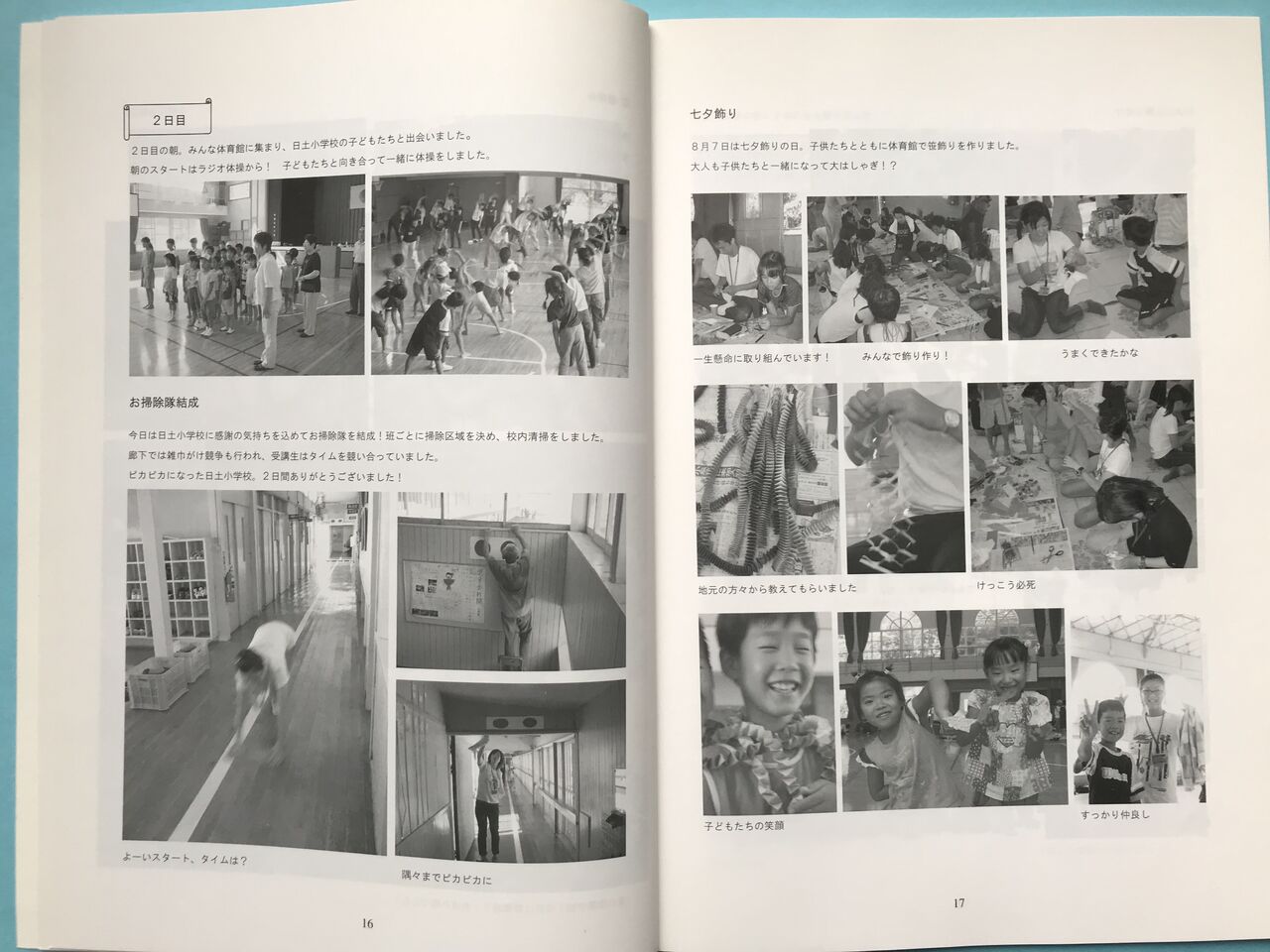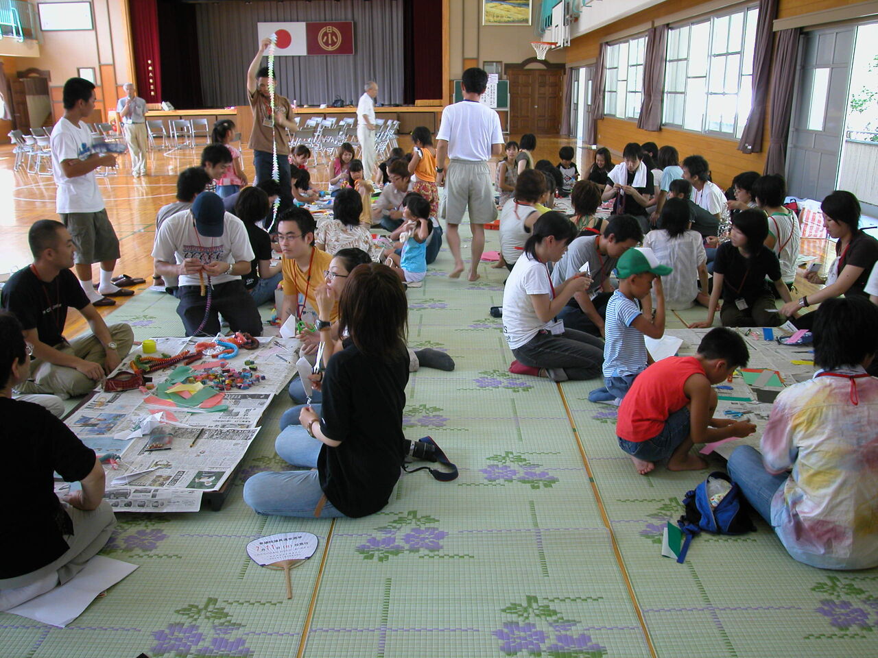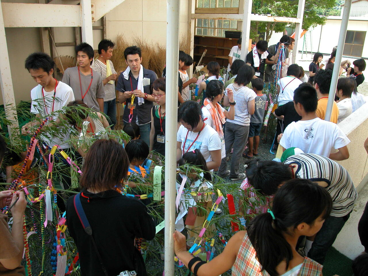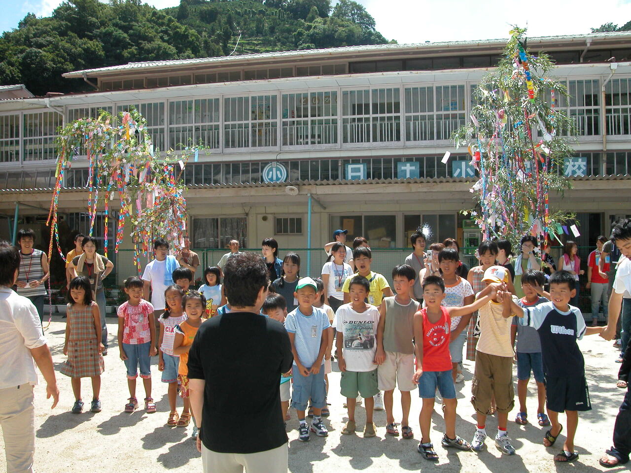 掃除が終わると次は子供たちとの交流会を行なった。体育館で七夕の飾りを一緒に作り、校庭に用意された2本の笹に飾りつけて記念撮影をした。