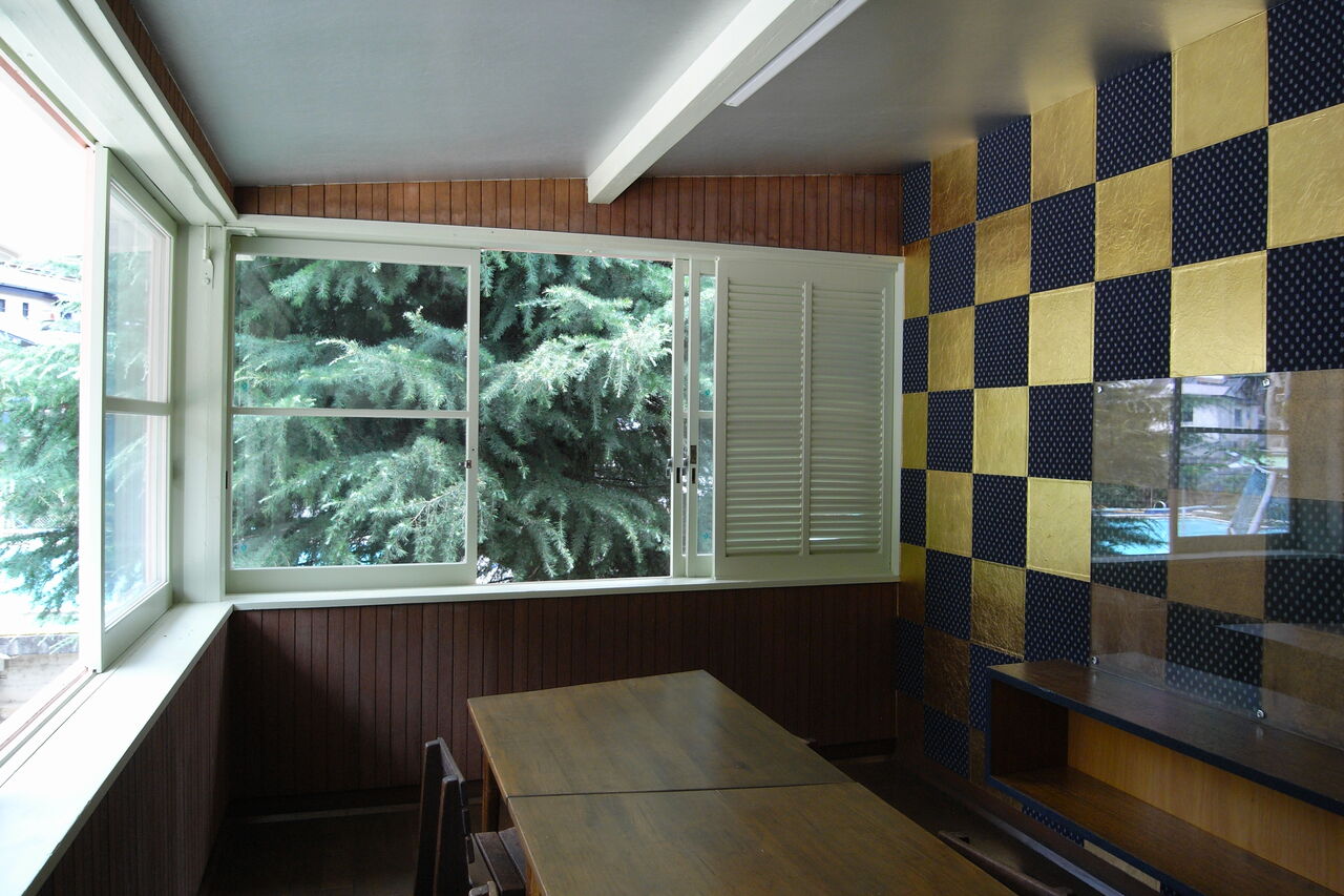 実はこの部屋は倉庫ではなく実施設計図には「補導室」と書かれており、先生が生徒にお説教をしたり、相談事を聞いたりした部屋ではないかと想像された。その部屋の壁が、金揉み紙と絣の市松模様で仕上げられていたのである。またそれ以外の壁は焼杉板で、窓には鎧戸があり、一般の教室とは違う特別な仕上げになっていた。松村が込めた子供たちへの優しい思いを関係者一同感じたのであった。参考までに、保存再生後の写真も載せておく。