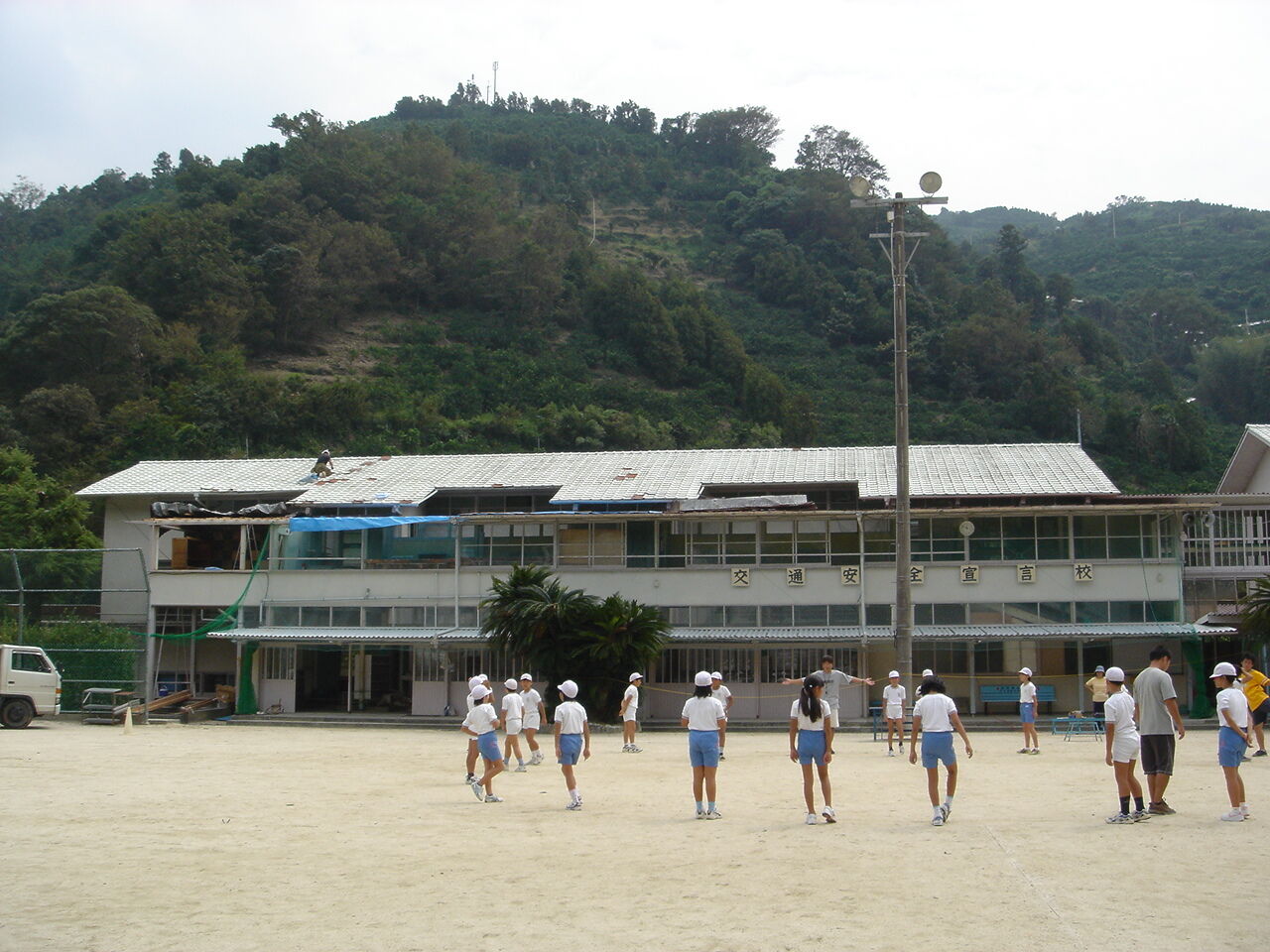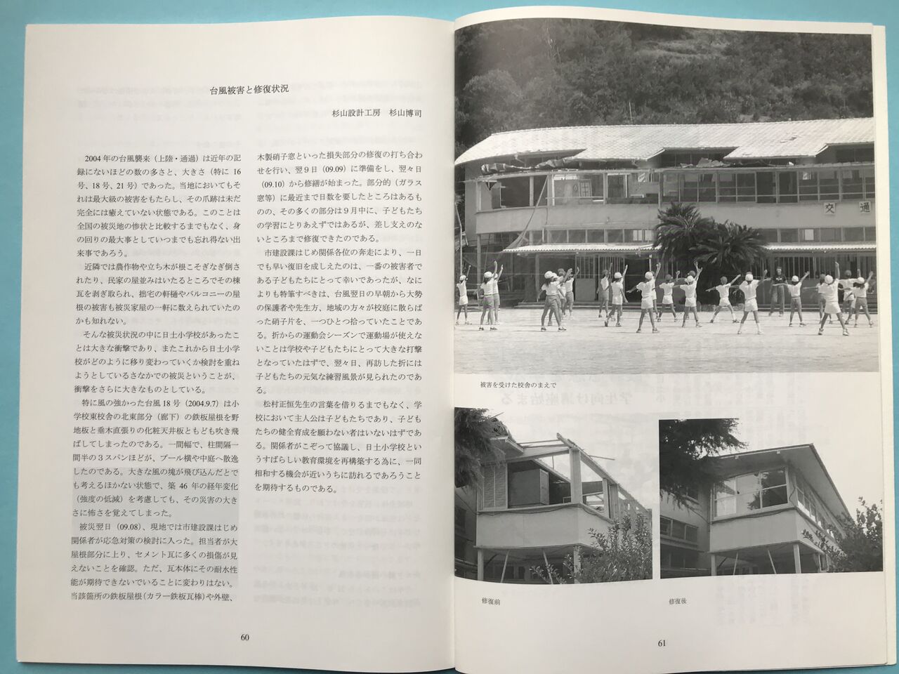 幸い、現地の対応は早かった。夏の建築学校のことをまとめた報告書(後述)の杉山博司さんの文章によれば、翌9月8日に八幡浜市建設課や関係者で応急対策の検討に入り、10日から修繕工事が始まった。そして大部分の作業を9月いっぱいで終え、学習に差し支えない状態になったのである。また被害翌日の早朝から、大勢の保護者、先生方、地域の皆さんが校庭に散ったガラス片などの回収にあたり、翌々日には運動会に向けた練習が無事行われたそうである。