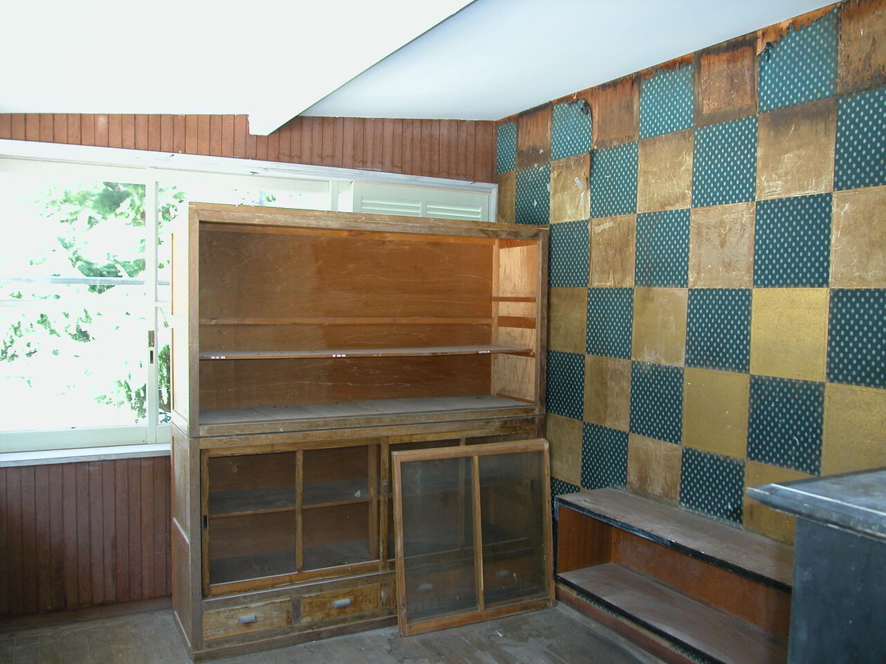 ところでこの被害にともない大発見があった。屋根が吹き飛んだ東校舎の廊下端部には小さな部屋があるのだが、物置として使われ開かずの間になっていたため、保存関係者は入ったことがなかった。ところがその屋根が吹き飛んだおかげで初めて内部を見たところ、そこには何とも優雅な意匠の空間が隠れていたのである。