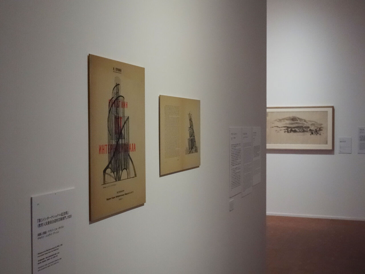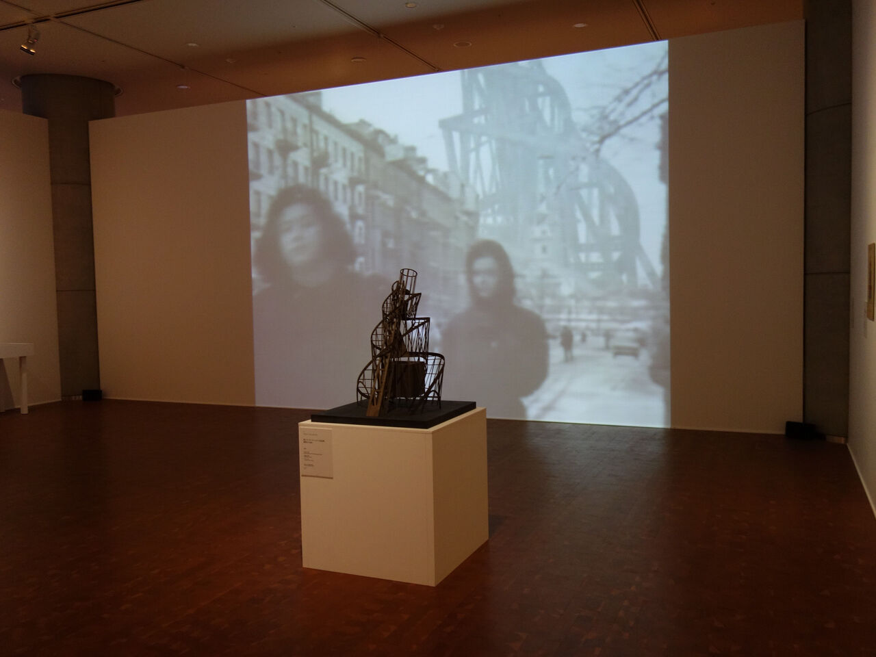 雨の止んだ午後、大阪・中之島にある国立国際美術館を訪ねた。舗道が濡れて写真を撮るには良い塩梅となっている。この美術館は2004年竣工の完全地下型美術館で、水の流れに身を任せながら地下三階の展示室へ降りて行く感覚。実現されなかった建築への思いが渦巻く暗闇の中に、現実の空間が広がっている。落下した水がはね飛んでいると言えるかもしれないが、エスカレーターから左に迂回し最初に眼に入ったのは、ウラジーミル・タトリンの『第3インターナショナル記念塔、模型(1:500)』。地軸の傾きに合わせた高さ84cmのオーク材による模型が、建てられていたら街をこのように支配したであろう想像力と共に置かれている。塔に登り、また、ネヴァ川に沿って車窓から眺めるような視点を持つ長倉威彦らによるCG映像が、およそ100年前に起こったロシア革命の、一国社会主義から人民圧制に至る歴史検証を示すような寒々とした景色に、神をたたえる尖塔や産業の勃興を高らかに歌ったエッフェル塔などとは違う、怪物のような記念塔として現れている。天井の存在を気づかせない模型とスクリーンの位置関係が、繰り返される映像の3分11秒と相まって、鉄柱の間を冷たい風が吹き抜けているように感じた。フードを被った女性とすれ違う、声は届かない。壁面には記念塔の図面に赤い文字が重なった表紙とニコライ・ブーニンのテキストがおぼろげに浮き上がって、複製品とはいえ資料好きには、嬉しい演出となっている。