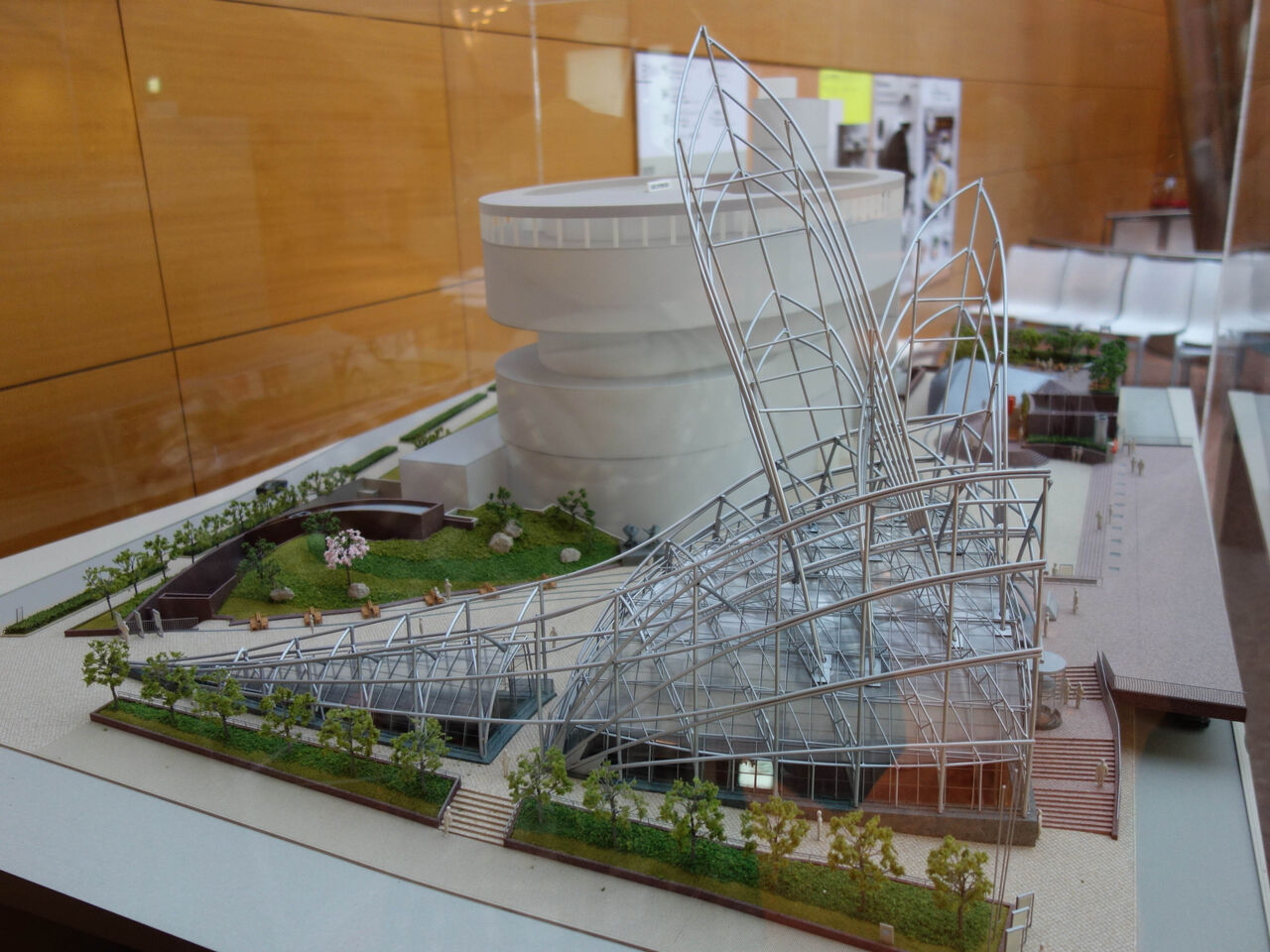 国立国際美術館「模型」外光に反射した会田誠の『シン日本橋』を抜け、美術館の地下一階に戻ると、国立国際美術館の模型が置かれていた。完全地下型美術館なので、地表にでているのは羽根のような構造物。地階の展示空間は想像するばかりだが、これはシーザー・ペリが設計し実際に建築されたもの。模型を見ながら自分はどこに立っていたかと思う、判らないことは心地良い。