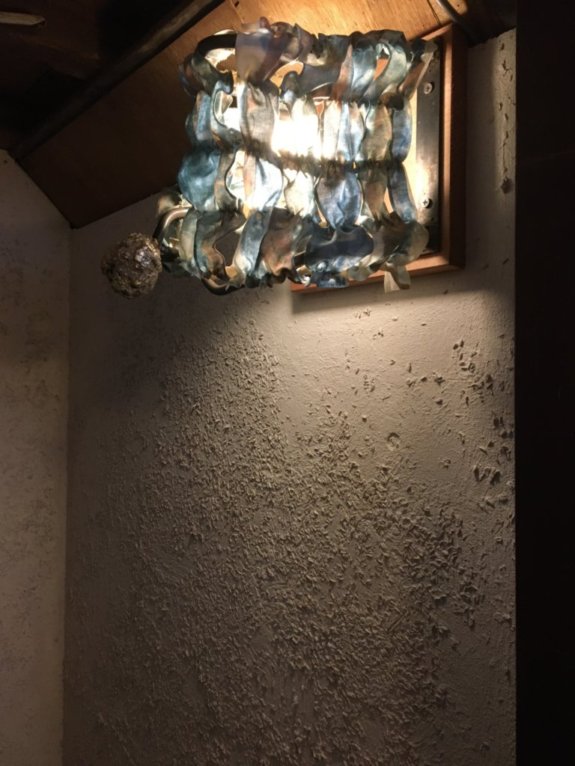 (壁掛け照明は周囲の壁面に光がバウンドするように考慮している。壁面は籾殻を濃淡つけて配布することで、表面の陰影をより深く見せるようにしている。(壁面仕上:瀬辺茂))