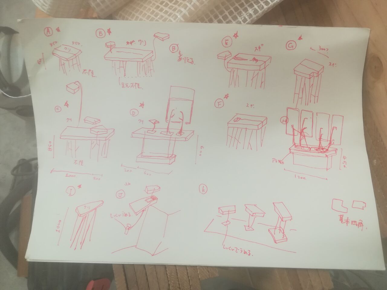 (制作した什器一覧。およその大きさと構造方法を決めた上で、細部の造形は制作者それぞれの手に拠るものとしている。もちろんそうした方法で制作できる人間は限られてはいるが、作業時間を考えてもその方が合理的である。)