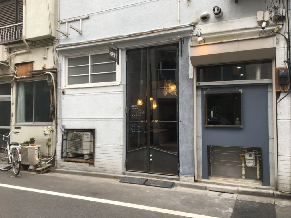 喫茶野ざらしの外観はかなり込み入っている。新しいものと古いものがファサードに混在しているが、高さ3Mの大きな観音鉄扉が視認性を高めている。