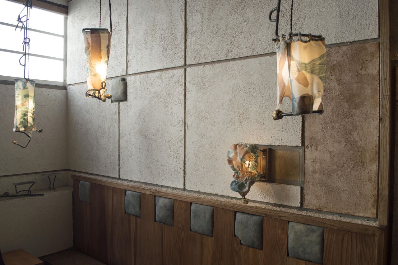 照明器具もこのプロジェクトのために制作している。自在鉤の構造システムで上下可動する鉄フレームに、藍染めと柿渋を組み合わせた布が付き、下部の真鍮を鋳造して組み合わせた鉄部品をつり降ろしている。壁掛け照明も真鍮、鉄、染めた布の組み合わせで電球を囲むシェードを制作した。(共同制作者:渡辺未来、河原伸彦)
