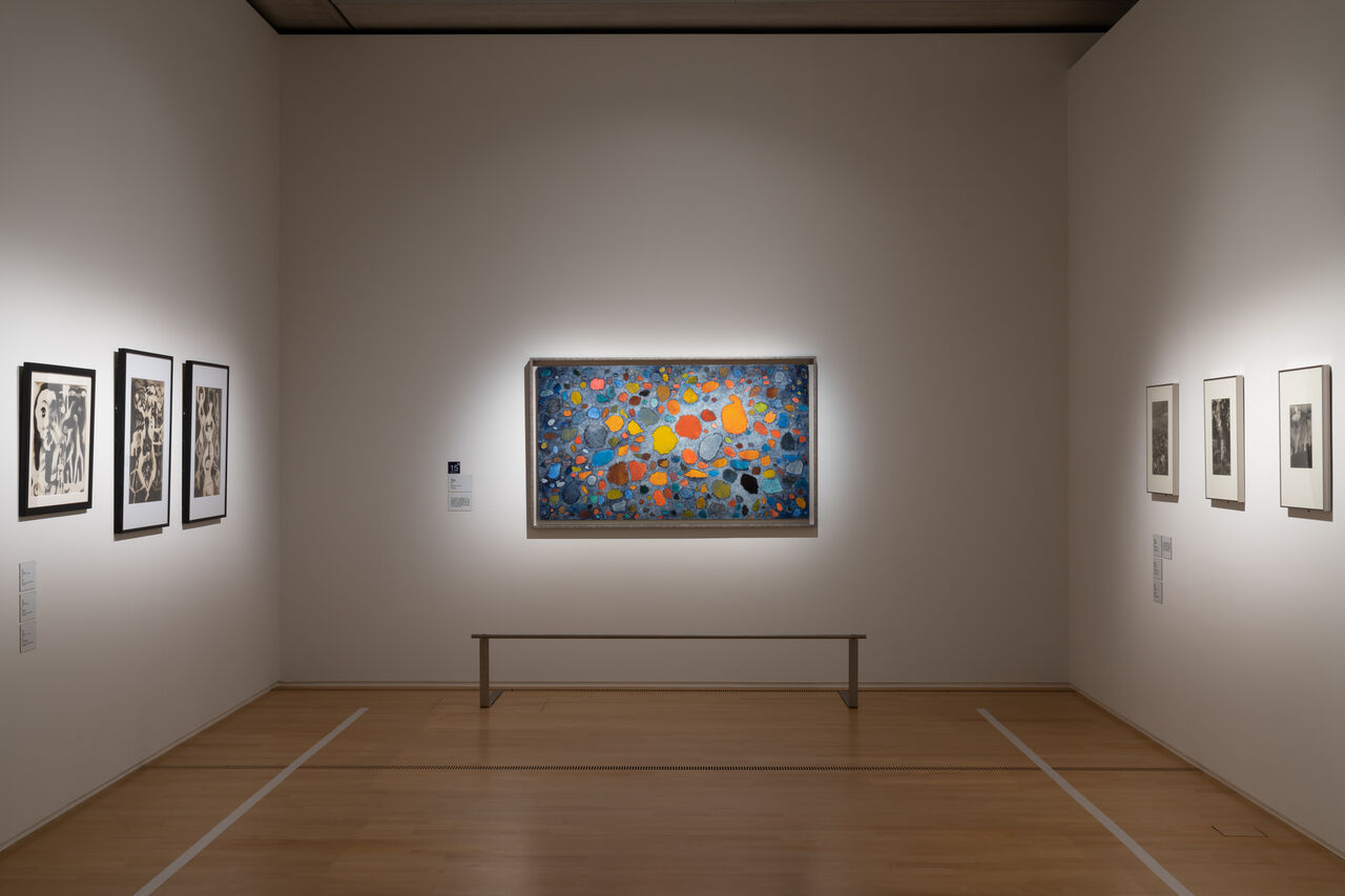 第二次世界大戦中に多くの亡命シュルレアリストを受け入れたアメリカで、その影響下に抽象表現主義が展開したように、日本で「超現実主義」を経験した画家たちが、戦後に抽象絵画への探究を進めました。例えば吉原治良の抽象の探究をたどると、シュルレアリスムの影響を受けた絵画から、物質的な技法の探究を経て、禅画を思わせる「円」へと到達します。戦前にマン・レイやモホイ・ナジのフォトグラムを応用した「フォトデッサン」を制作した瑛九は、戦後に「野生の状態の眼」を思わせる光彩を散りばめた抽象の絵画へと探究を進めていきました。日本における超現実主義の独特な展開をみると、その転換には断絶よりも連続をみることができます。