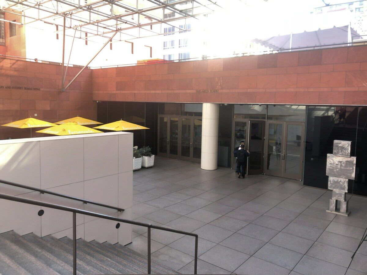 半地下になっている入場口。向かいはカフェスペース。入場は基本無料ですが、来場記録のために階段を下りる前にボックスオフィスでチケットを発券してもらう必要があります。