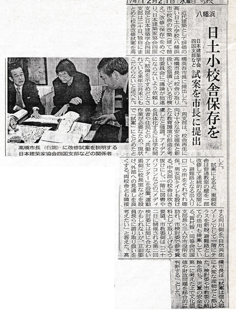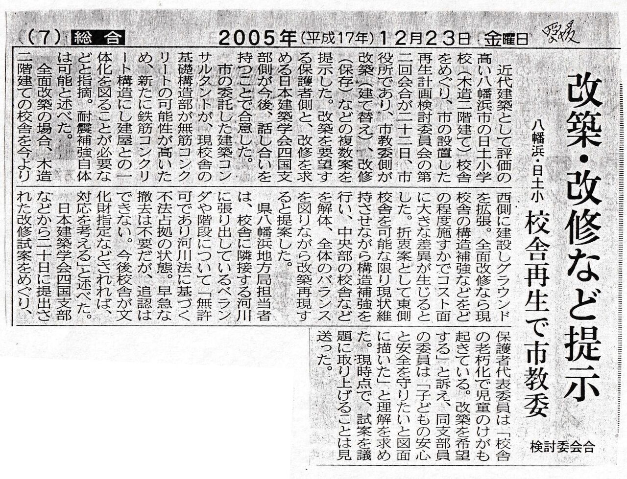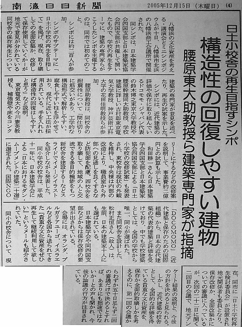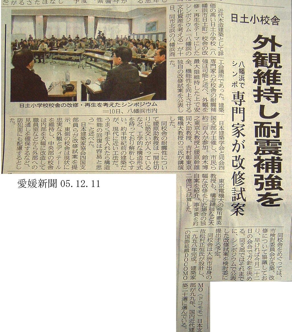 第二回の「八幡浜市立日土小学校再生計画検討委員会」の様子を伝える2005年12月23日愛媛浜新聞の記事しかし、これは次回以降の予告になるが、2006年中頃に八幡浜市はついに日土小学校の保存再生を決定し、日本建築学会四国支部へ現況調査と基本計画の策定を正式に依頼する。今回のシンポジウムは、そこへの道筋をつけたきわめて重要なものであったとあらためて感慨深く思った次第である。