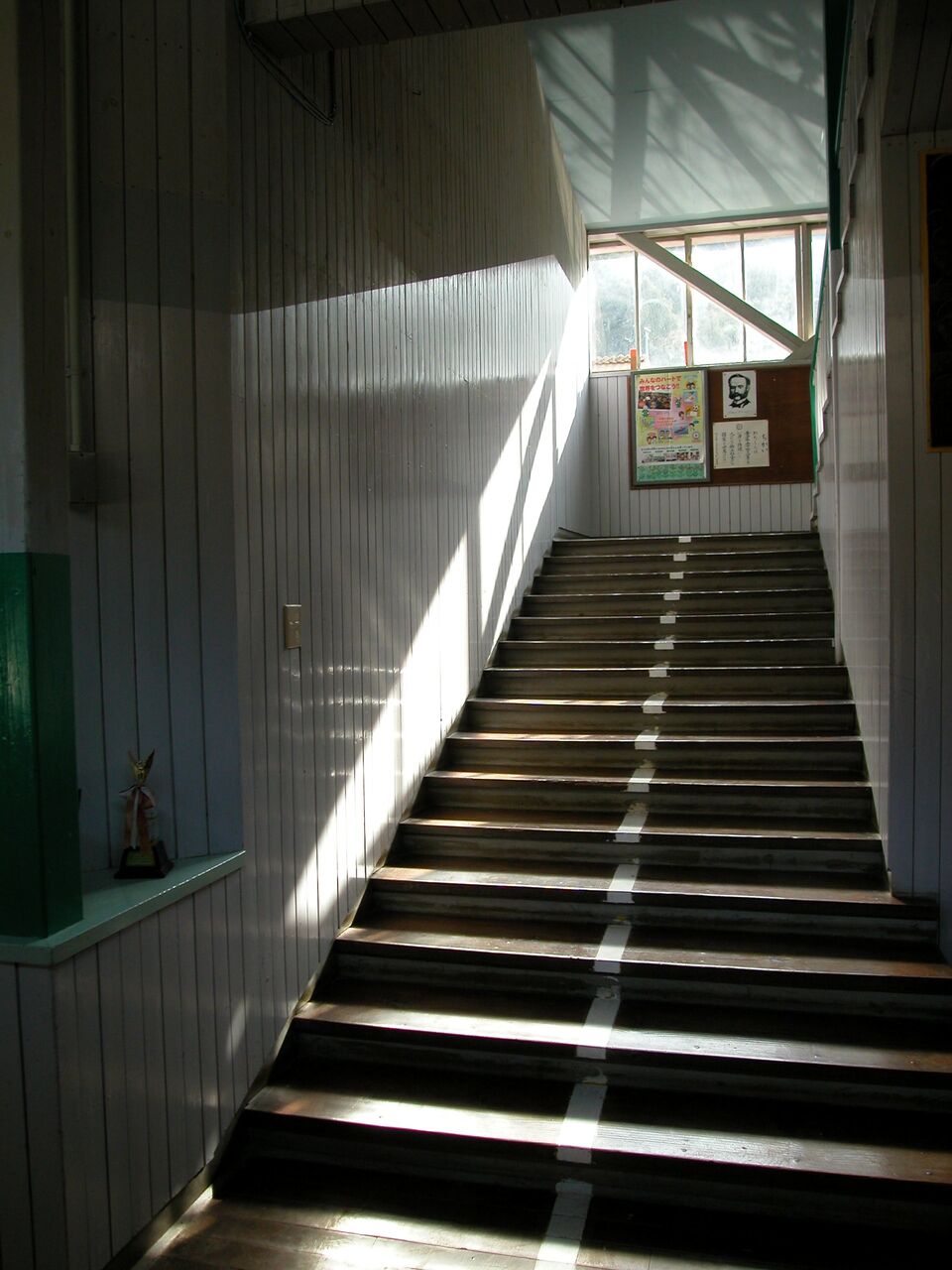 冬の光が射す中校舎の階段13時から八幡浜商工会議所でシンポジウムが始まった。(2)と(3)はそちらでの話である。