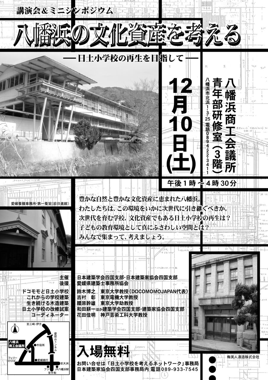 シンポジウムの名称は「八幡浜の文化資産を考える—日土小学校の再生を目指して—」、会場は八幡浜商工会議所と決まり、プログラムの検討、改修案の検討、チラシ作成、広報計画など、さまざまな準備が進んでいった。
