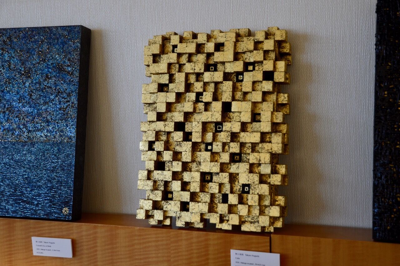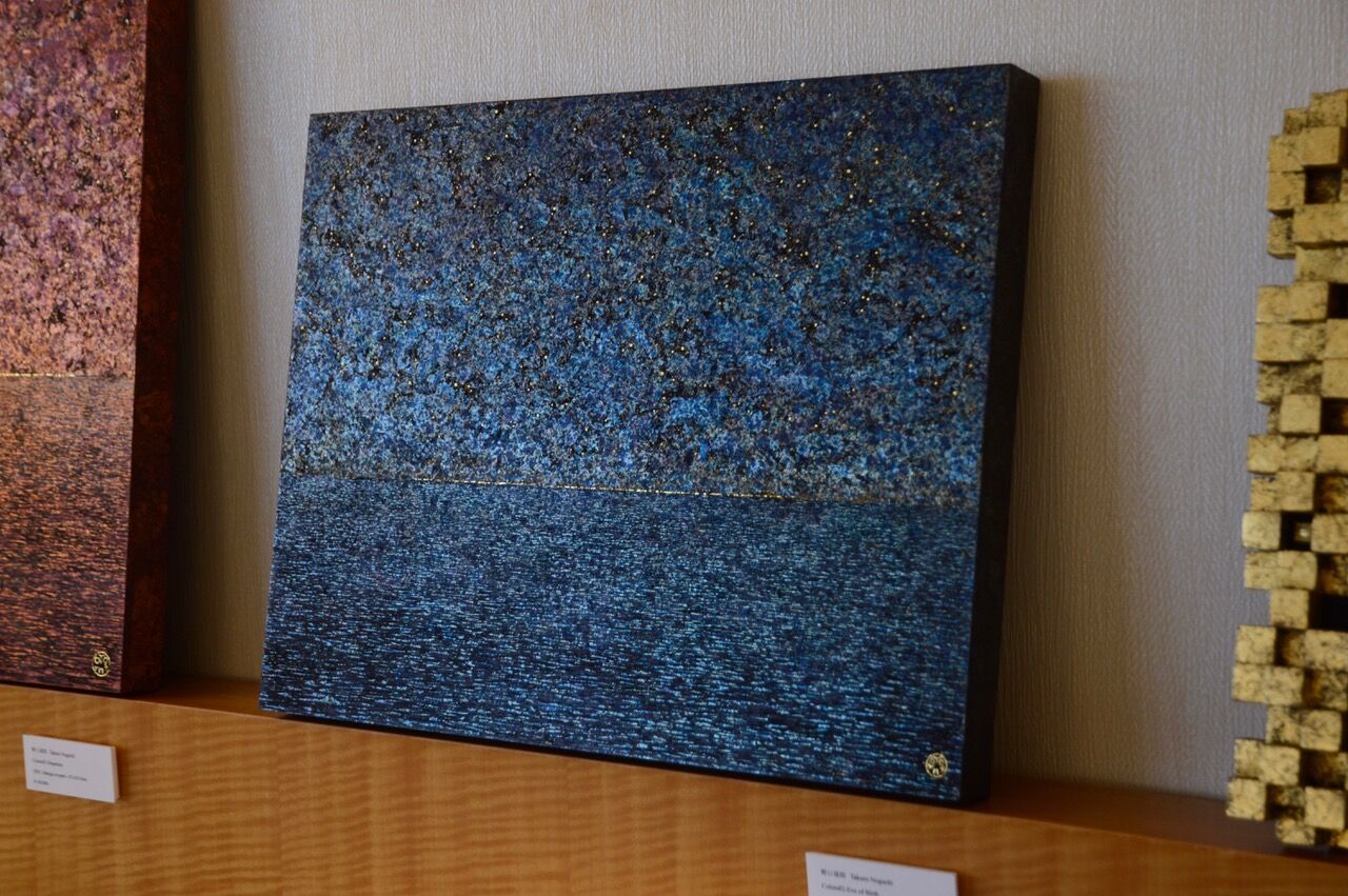 箔画/木パネル、漆、金・銀・プラチナ箔、石炭、樹脂、アクリル絵具