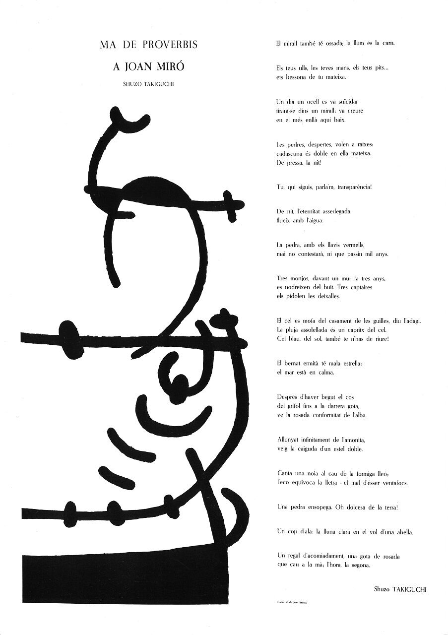瀧口修造の詩「手づくり諺」7ヵ国語それぞれ1面ずつに、ページごとにかえられたミロの装画7枚、それにオリジナルリトグラフ8枚と装画入り表紙による詩画集『手づくり諺』の展観。ミロの版画集『アルバム19』(1961年)と『ひびわれ』(1969年)を展示。