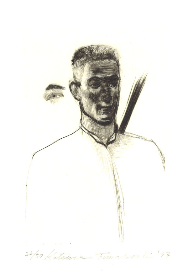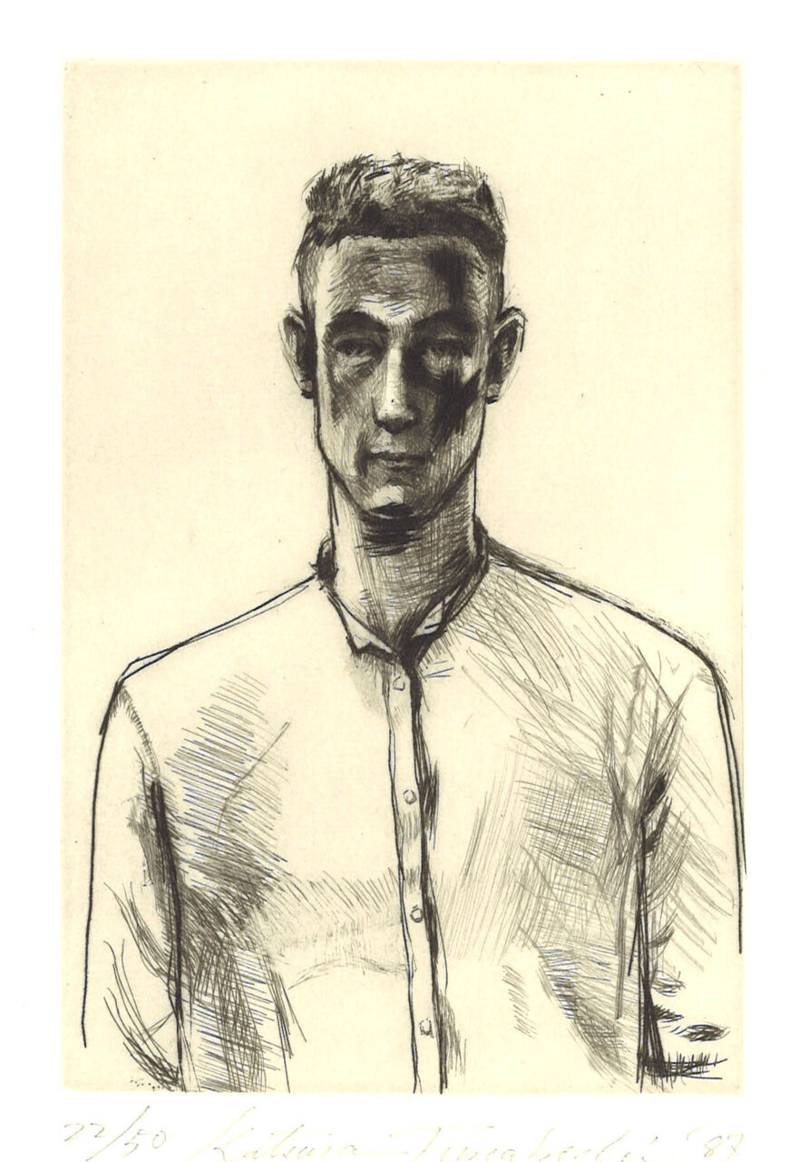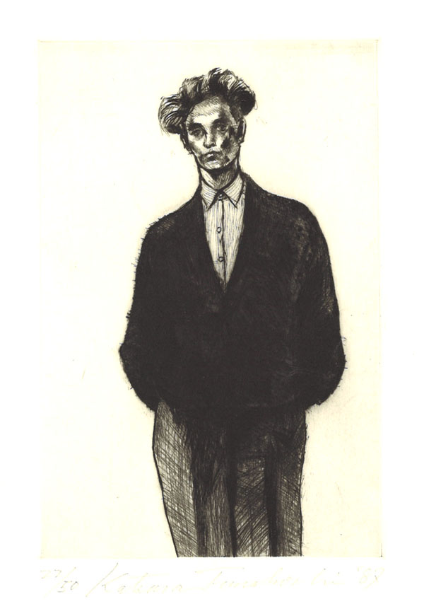 舟越桂先生が彫刻の初個展をしたのが1982年、銀座の貸し画廊、ギャラリーオカベででした。1986年~87年にかけて舟越桂先生は文化庁の在外研修員に選ばれロンドンに留学します。そのとき、初めて銅版画3点を制作されました。