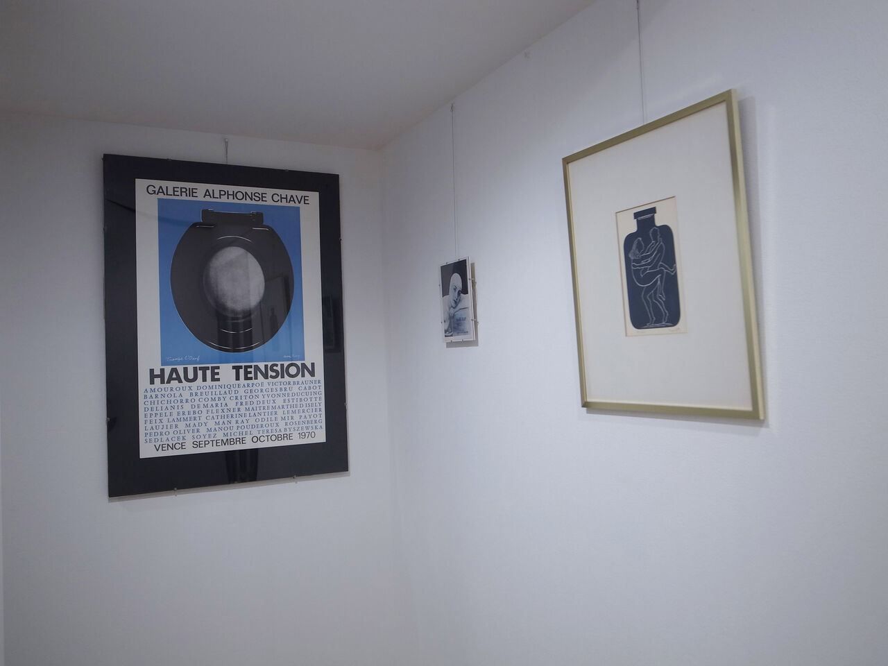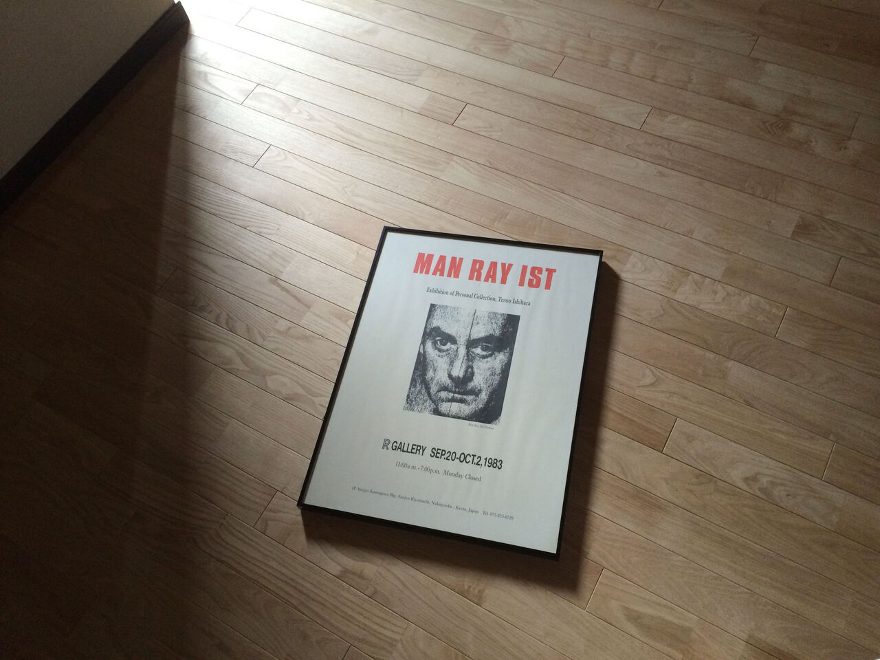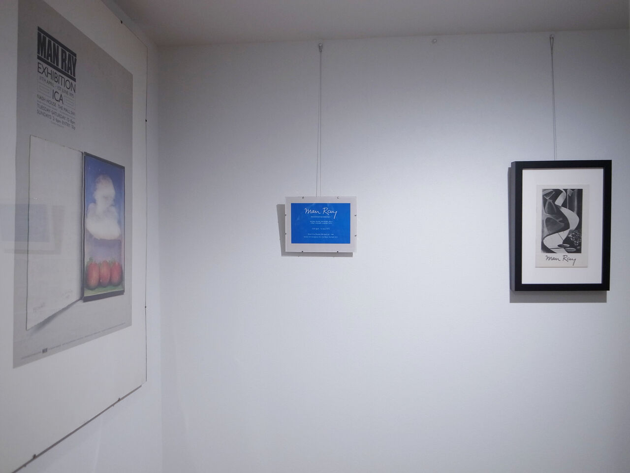 「拙宅でブラパチ」はこれまでの展示回想となるけれど、2017年の夏は水の青を連想してヴェニスのアルフォンス・シャーブ画廊が1970年に開催したグループ展『ハイテンション』の折のミクストメディア『だまし卵』(1930/1963)を使ったポスターと瓶の中で抱き合う男女を描いた版画『おやすみマン・レイ』(1972)の間に水泳帽を被ったメレット・オッペンハイムを置いた。これはツァイト・フォトサロンでの最初のマン・レイ展(1978)のもの。また、一昨年の秋、永年探したポスターを入手して展覧会「三種の神器」が揃った折には小企画「ICAのマン・レイ」としてロンドン現代美術研究所でのポスター、案内状、カタログを並べた。オリジナル作品を掛けるのも楽しいが、気楽な紙ものを気楽に掛ける、築不詳の拙宅にはこれが似合う。しばらく手を離れ、額に入ってよそいき顔をしている「愛しい物」たちの、日本までの旅路、45年の移ろいに思いを馳せる。青ベタ白抜きの筆跡再現に涙腺が緩むのはわたしだけだろうか。