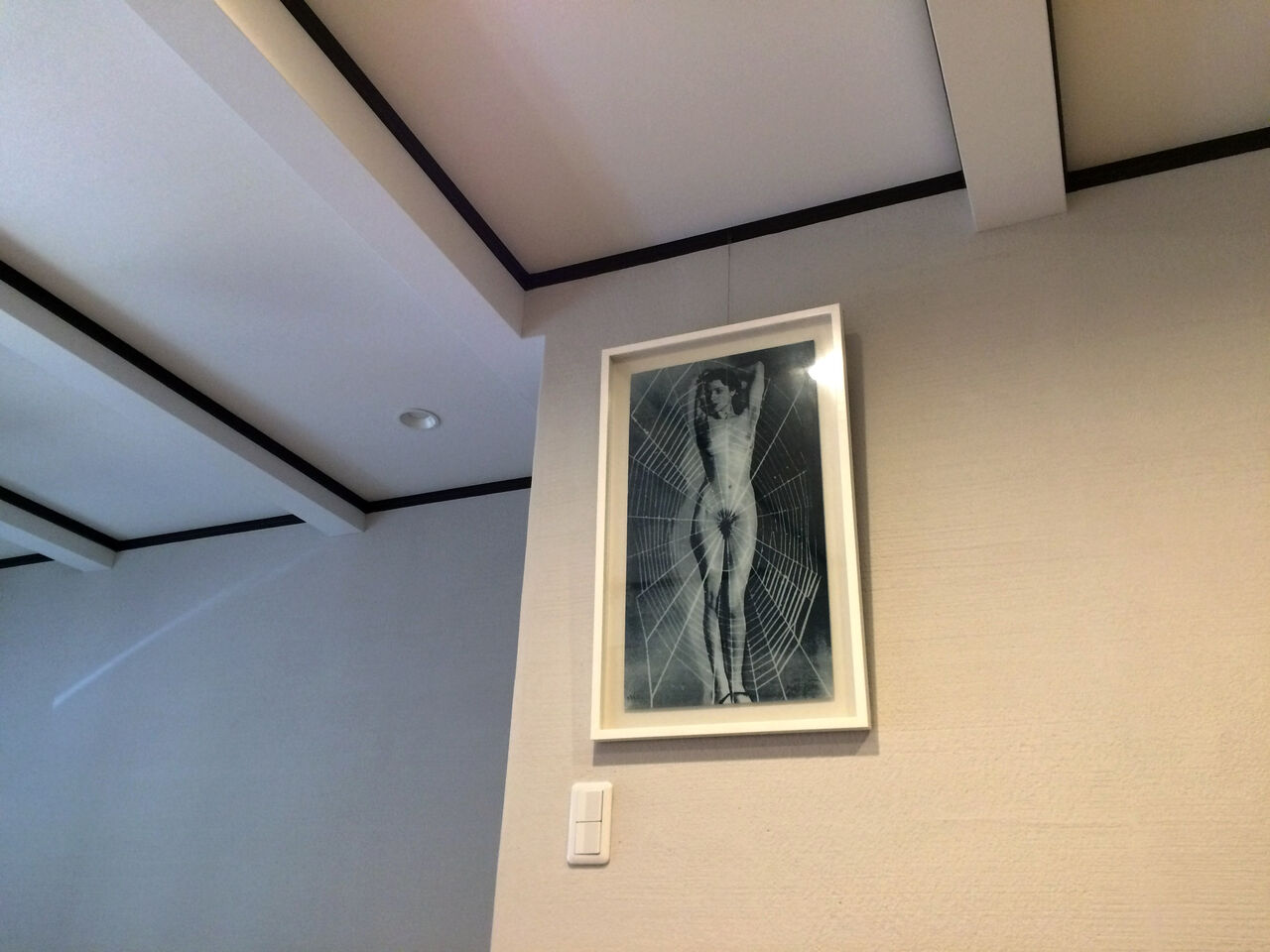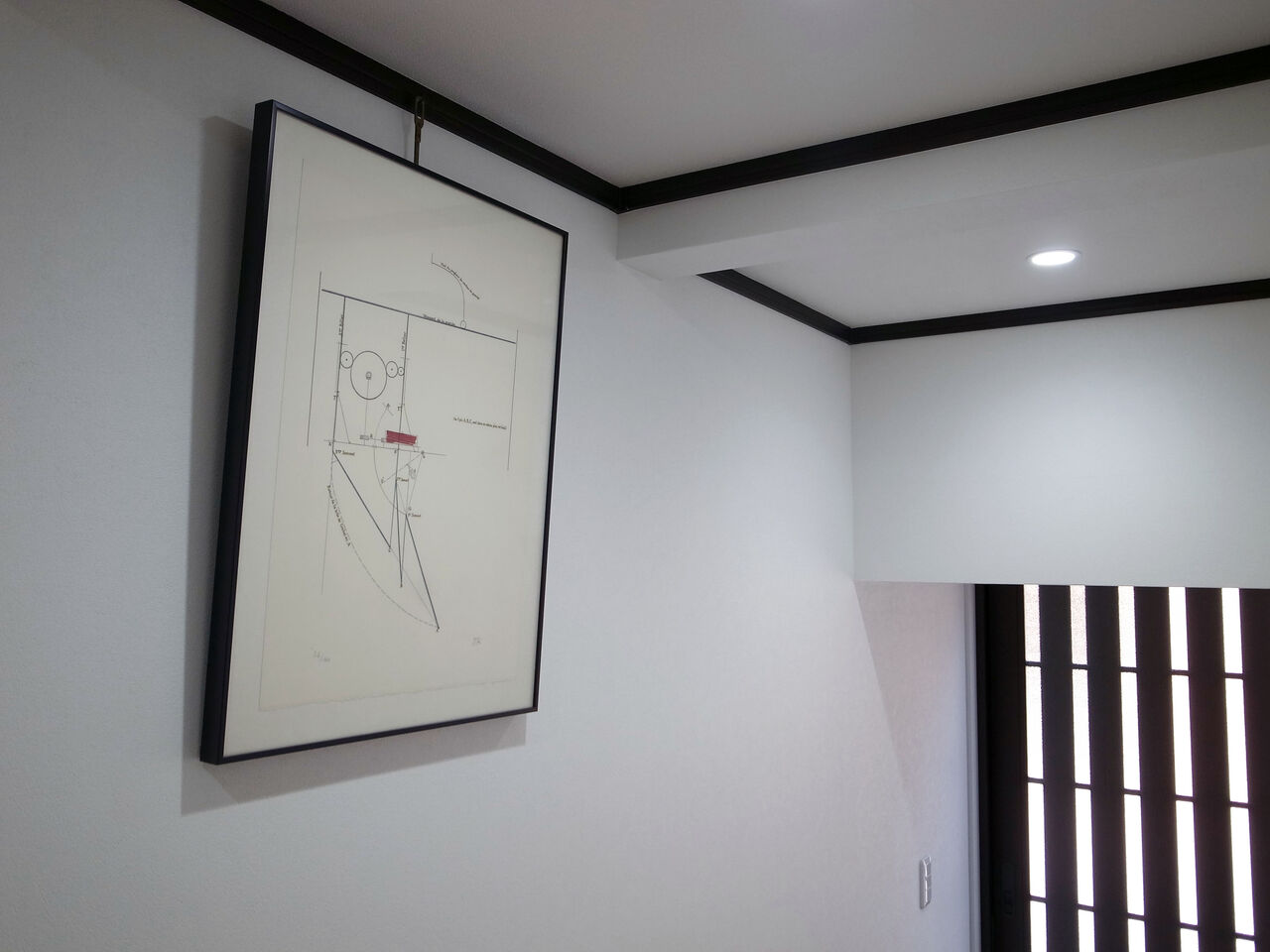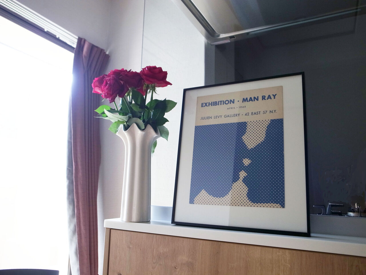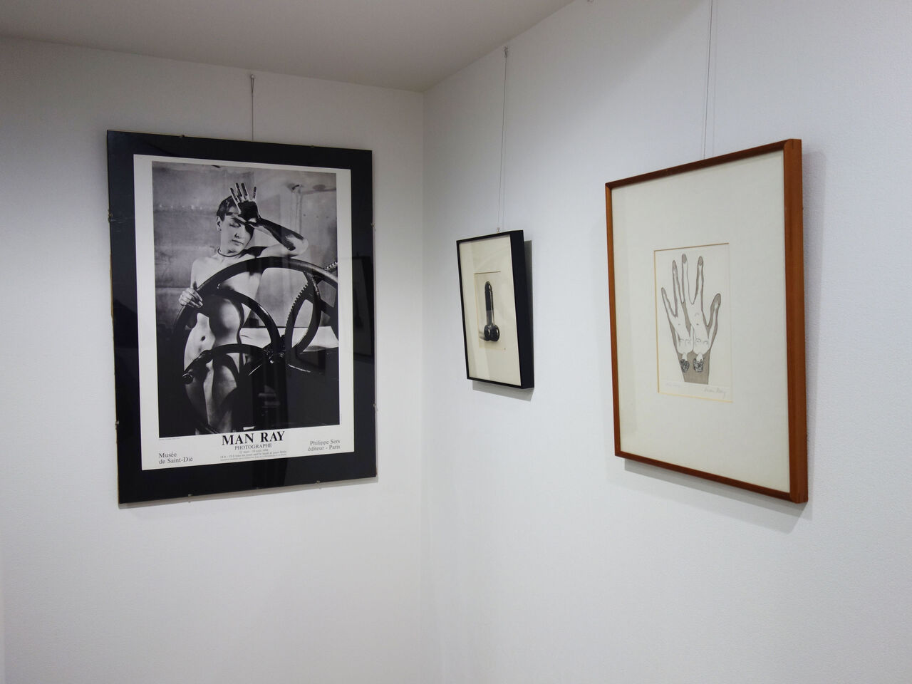 拙宅は京都市内の弱小住宅、作品を鑑賞する壁面は限られる。床の間の掛け軸なら季節を先取りするのが定石、とはいえマン・レイに季節感を求めるのは難しい。拙宅では来客の好みを考慮した展示にする事が多く、今日現在は昨年末からの設えで、メレット・オッペンハイムの展覧会ポスター(1988)と版画連作『電気魔術』(1969)を挟んで新婚旅行で求めた『プリアポスの文鎮』(1920/ca.1966)を飾っている。このお客さんは写真の研究者でお酒も楽しまれる、エロティックなものもお好きかと誘いをしてみた。デュシャン研究者の時には玄関に「大ガラス」の独身者たちと花嫁を繋ぐメカニズム部分のマン・レイ版『ボクシングマッチ』(1970)を飾った。この壁面は『MAN RAY IST』展(1983)のポスターを掛ける定位置、会話を予測し作品を選ぶのは楽しい。額に入れた見開きのジュリアン・レビュー画廊『我が愛しのオブジェ』展(1945)カタログなどはお化粧をしている感覚で、「デュシャンには薔薇だよな」とキッチンで一人見入っていた。