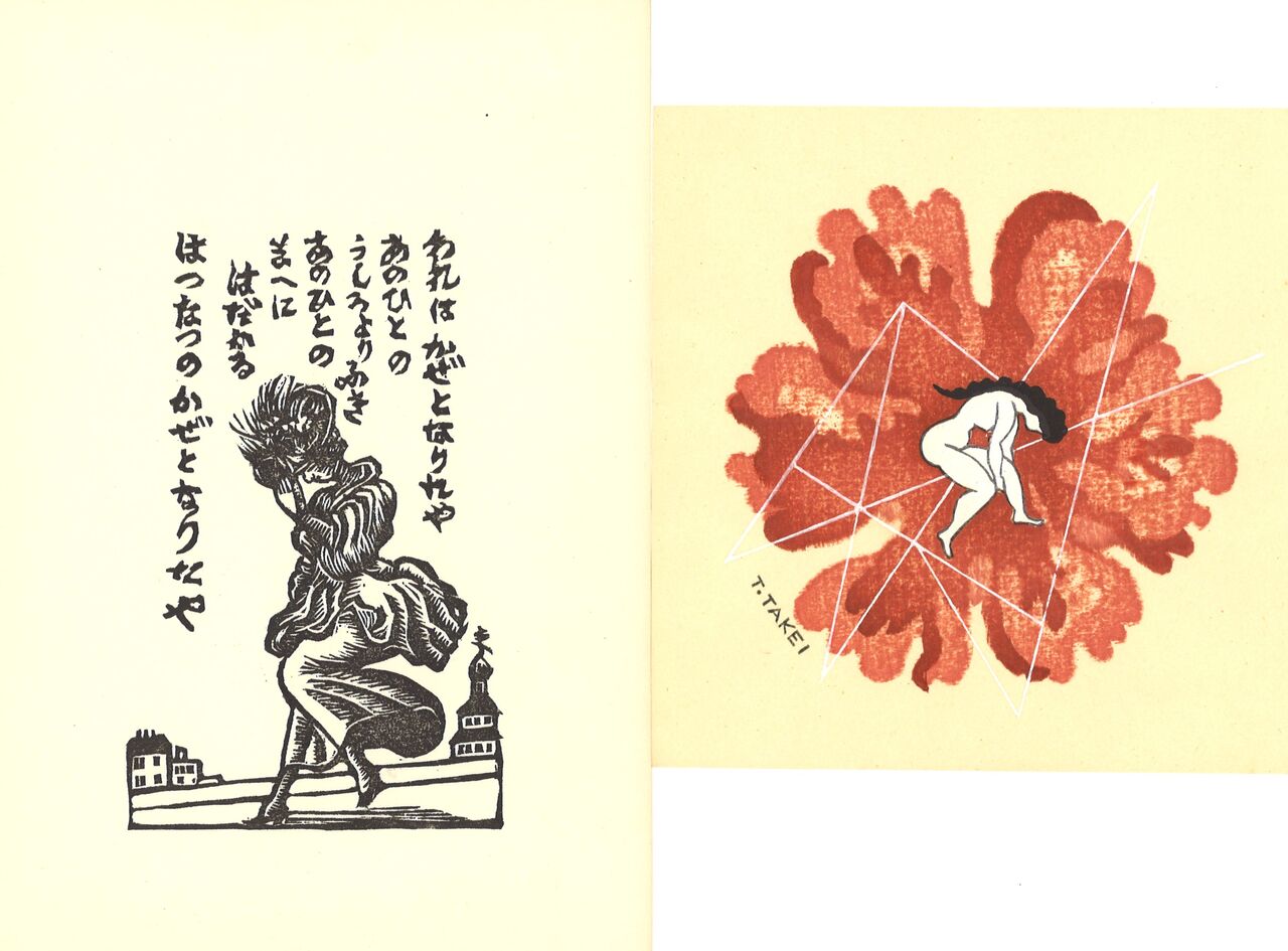 右)武井武雄「開花」木版 13×12cm  版上サイン
