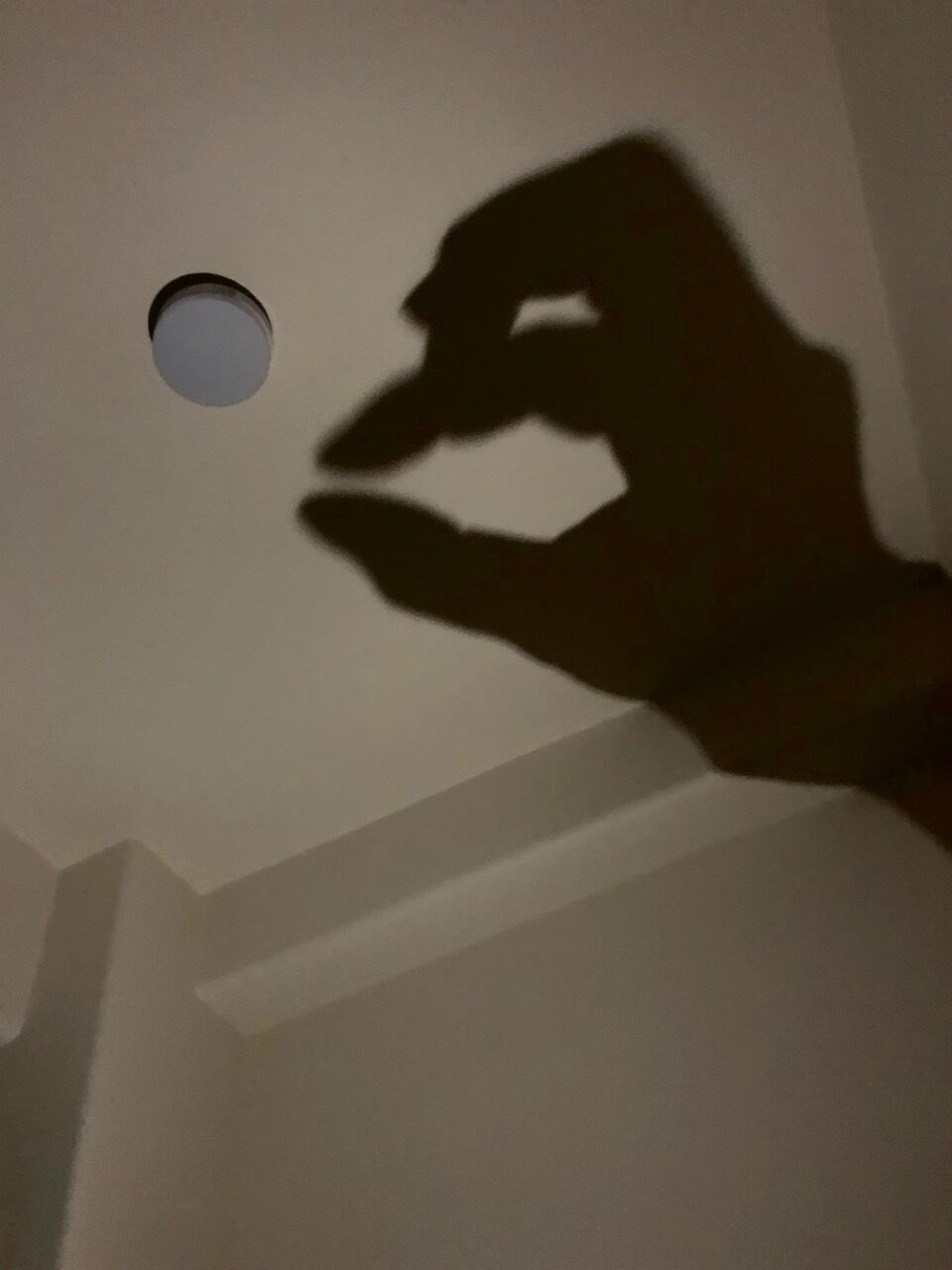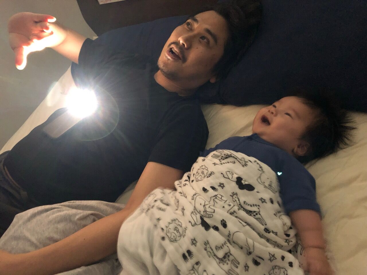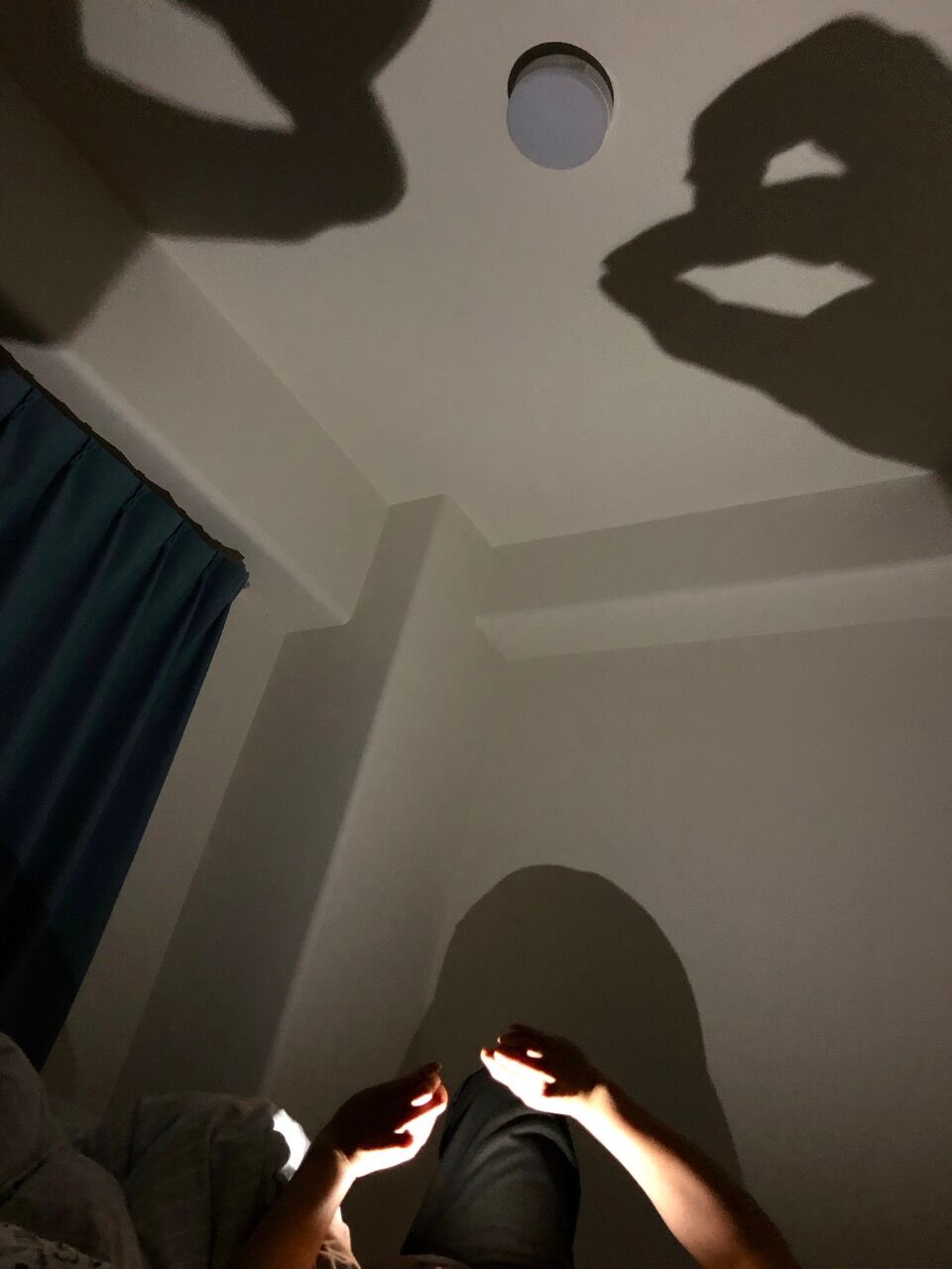 あと、ふと思いついて、iPhoneのライトを使い、暗い寝室の天井に指を使った影絵を映すと、とても興奮して声をあげながら見ていたので、次は影絵用の型紙でも作ろうかなと思います。