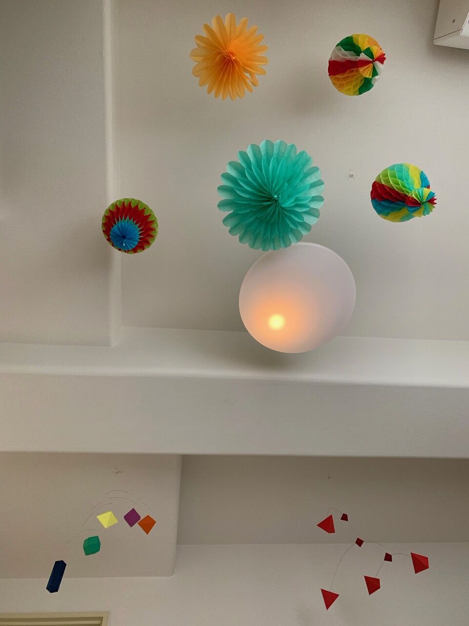 また、あまり外出もできない現状で、まだ寝ている姿勢の息子が少しでも色々なものに興味を持つように、天井からペーパークラフトの気球やモビールをぶら下げたのですが、想像以上に興味を持ち、動いたり回転するのをじっと見ています。