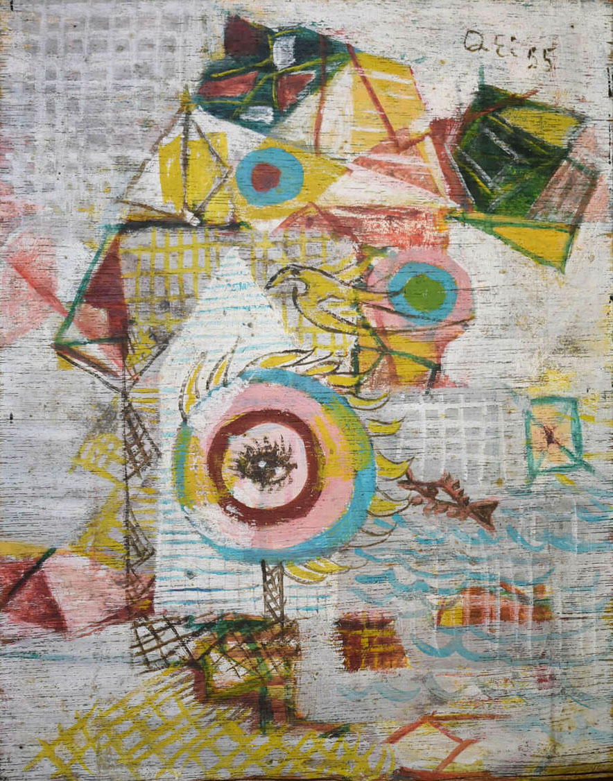 作家の言葉:自己から脱出して絵画の中に突入できるかどうか、最後の冒険を試みようとしています。(瑛九)