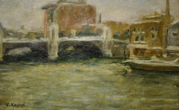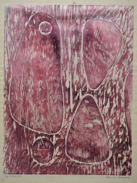 なお、今回のM氏コレクションの展示には油彩画が1点、木版画が1点含まれている。駒井の油彩画では東京芸大蔵の自画像(1943)がよく知られているが、その他についてはほとんど情報がない。今回の出品作は署名から初期のものと判断され、綿貫氏が推測されたように、数寄屋橋周辺の風景が描かれているとみられる。駒井は1975年の岡田隆彦氏との対談で美校時代を振り返り、「油絵もずいぶん描きましたよ。やはり川岸を描いたり、それからずいぶんやはり裸婦を描きましたね。」と語っている。1941年の文展入選の《河岸》を始め、戦前の駒井の銅版画でも川岸はお気に入りの題材のひとつであった。木版は彫刻刀の彫り跡が荒々しい紅一色の抽象作品である。署名は晩年のものに思われるが、制作はずっと遡る可能性が大きい。制作年の特定は今後の研究を俟ちたい。
