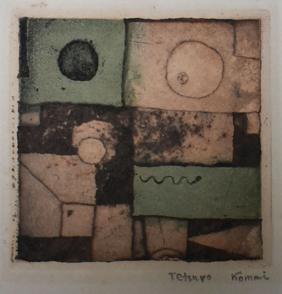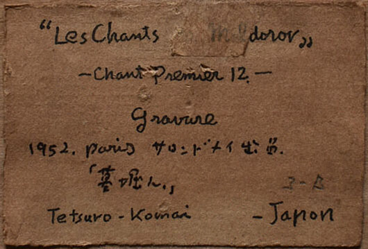 2009年のときの忘れもので開催された「S氏コレクション 駒井哲郎PART I展」にも《化石》のエディション番号1/20のものが出品されていたが(no.4)、興味深いことに、そこではT Komaiと署名がなされていることである。今回のエディション番号3/20の《化石》は先述した1952年の展覧会のために刷られたものと予想されるが、ここでは署名がTetsuro Komai となっており、その間に署名の形式が変わったものと推測できる。