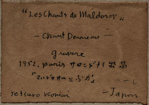 《墓堀人》《鱶とマルドロオル》(いずれも1951年)は、ロオトレアモン(青柳瑞穂訳)『マルドロオルの歌』(限定350部、1952年)のための挿画である。挿画ではサインなしで本に閉じ込まれたが、展覧会出品等のために署名入りの別刷りが何点か制作されている。両作品には、1952年5月のサロン・ド・メイのための自筆の出品票が貼られている。『駒井哲郎 若き日の手紙』には、「来年の五月にはフランスであるサロン・ド・メイの展覧会に、招待出品を受けました。版画では棟方志功氏と僕だけです。」との一節があり、《時間の迷路》「夢」連作3点、『マルドロオルの歌』挿画5点が出品された。