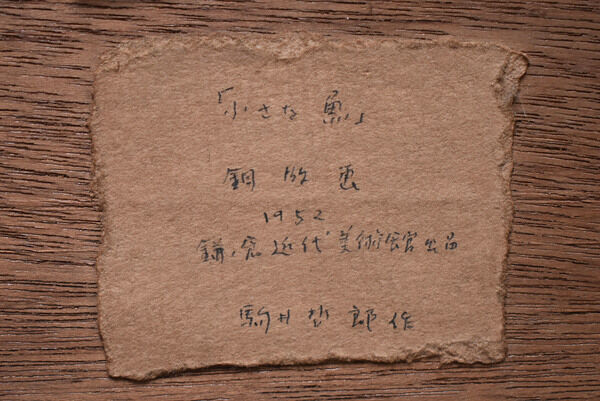 《化石》(1948)には、1952年7月に鎌倉近代美術館(神奈川県立近代美術館)で開催された「現代創作版画六人展」には自筆の出品票が貼り付けられており(写真)、「「化石」/銅版画/1952/鎌倉近代美術館/駒井哲郎作」と読み取れる。この展覧会には、恩地孝四郎、平塚運一、川西英、斎藤清、棟方志功といういずれも一世代前の木版画家が選ばれており、銅版画家として唯一、しかも30過ぎの若手で選ばれたことは、当時の新星・駒井への評価と期待の高さがうかがい知れよう。《小さな魚》(1950)にも、同じ展覧会への自筆の出品票が貼付されている(写真)。美術館名に「出品」の語がある点のみが《化石》とは異なっている。