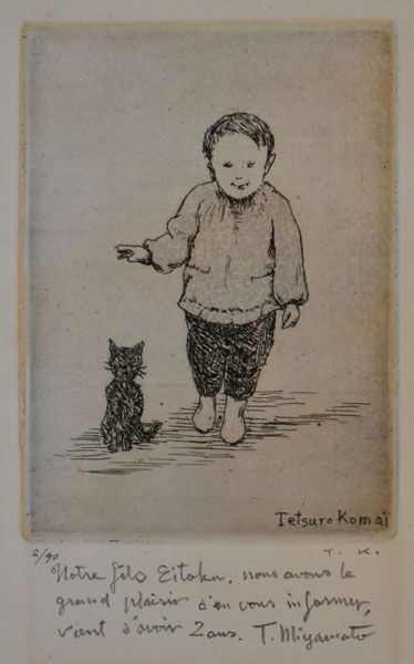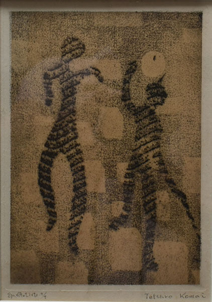 M氏の駒井哲郎コレクションは全部で27点ほどあったとされ、すでに《悪童》(1950)と《夜の中の女》(1951)は福原コレクションに入ったという。今回出品の《誕生祝い》(1960)はM氏長男のために制作されたもので、M氏と作家との親密な関係を物語っている。また、クルト・セリグマン作「ロマンチックの産業」の摸刻(1936頃)の原版を用いた1969年の年賀状も珍しいものである。