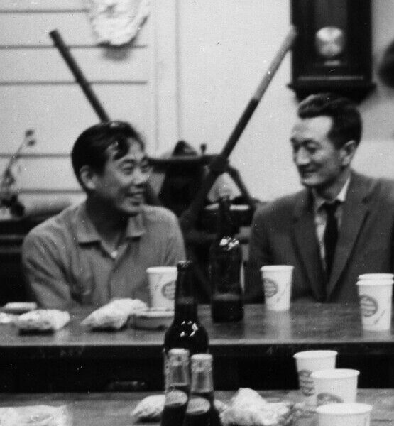 今回、M氏コレクションの一部が展示されるわけだが、なかでも目を引く軸物(No.17)、画家津田青楓の寄せ書きがある。1973年、M氏が中央線中野駅近くに開廊した中野画廊へ寄せた内容となっている。「僕ノ孫弟子に当ル」M君とある。さて直系の「兄弟子」にあたる人物はだれであろう。津田は画塾をなんども運営した経歴をもつのではっきりとはしないが、1枚の写真から想像すれば、オノサト・トシノブが浮かび上がる(図1 )。