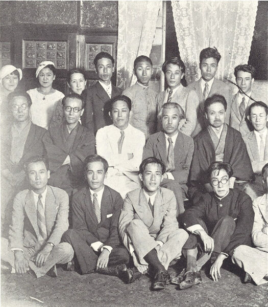 図1 津田画塾懇親会 1933年9月 中列左より 三木清、谷川徹三、東郷青児、津田青楓、安井曾太郎、板垣鷹穂、板垣の後ろがオノサト・トシノブ、前列及び後列は塾生(『盲亀半世記